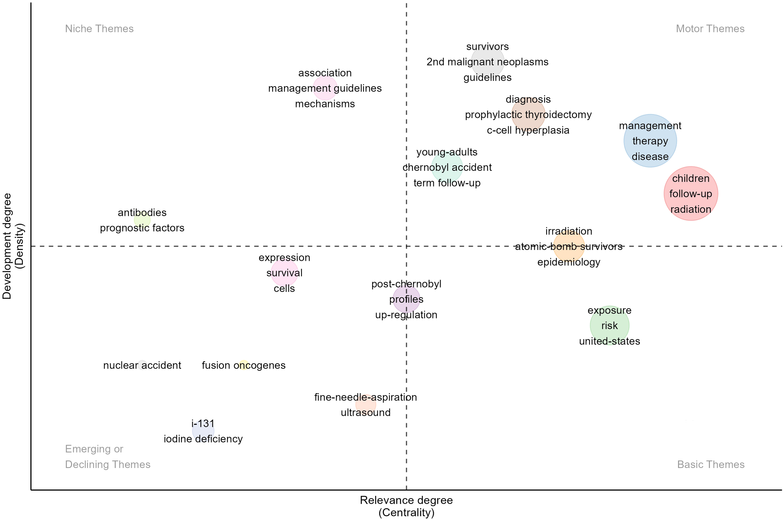 Finally, to help scholars accurately determine the direction of the evolution of childhood thyroid cancer and the development potential of different themes, we conducted a thematic strategic coordination analysis (Figure 8). The results showed that there were five clusters located in the first quadrant; with high centrality and density, these were the hotspots and core themes. These themes were summarized as follow-up after radiotherapy, treatment management, diagnosis and prevention, and secondary primary tumors. The second quadrant represented isolated themes with strong internal but weak external connections, including “antibodies,” “prognosis factors,” and “mechanisms.” The themes in the third quadrant had low centrality and density, indicating emerging or declining topics, such as “nuclear accident,” “fusion oncogenes,” “i-131,” “iodine deficiency,” “fine-needle-aspiration,” and “ultrasound”. The basic themes in the fourth quadrant had high centripetal degrees, including “exposure” and “risk”. Additionally, we observed that there were two class clusters at the intersection of two quadrants. “Atomic-bomb survivors” and “irradiation” were at the intersection of the first and fourth quadrants, indicating increasing research interest. “Post-Chernobyl,” “profiles,” and “up-regulation” were at the intersection of the third and fourth quadrants.