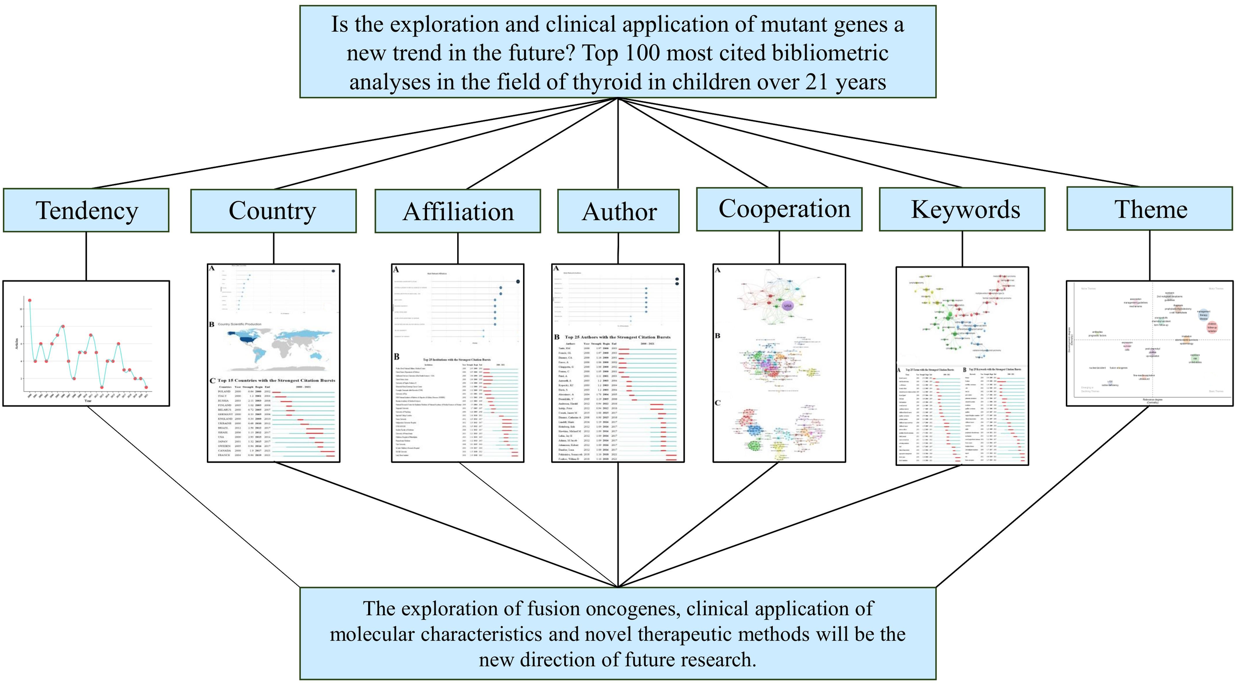 Extensive research has been conducted on the basic problems of pediatric thyroid cancer, and there has been significant outputs in the follow-up and cohort analysis of conventional diagnostic and treatment methods. However, these methods still have certain limitations. Therefore, scholars should focus on exploring fusion genes, the clinical applications of molecular targets, and novel treatment methods. This study provides a strong reference for scholars in this field.
