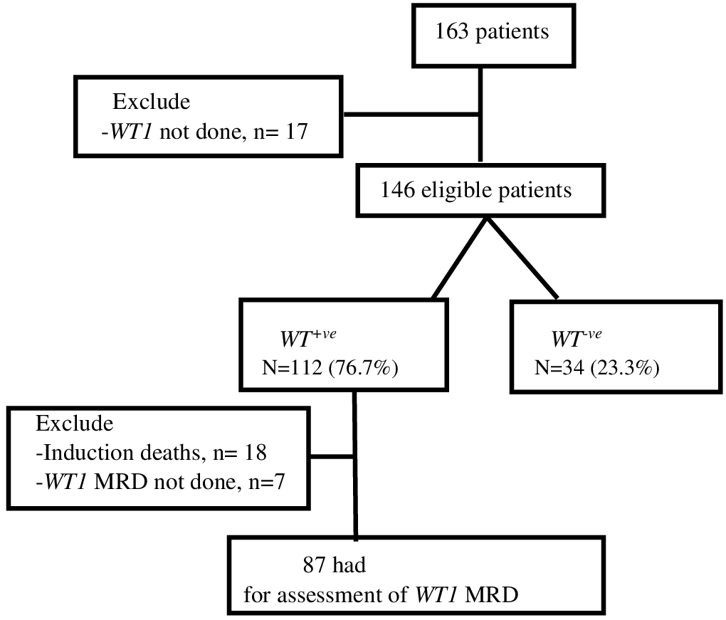 Wilms tumor gene 1 (WT1) is overexpressed in approximately 80% of children with AML. Previous cohort studies in children and adults evaluated WT1 gene overexpression at diagnosis, during treatment, and pre-, and post-hematopoietic stem cell transplantation (HSCT) to provide a target for novel immunotherapeutic approaches and to advocate it as a universal marker for MRD assessment.