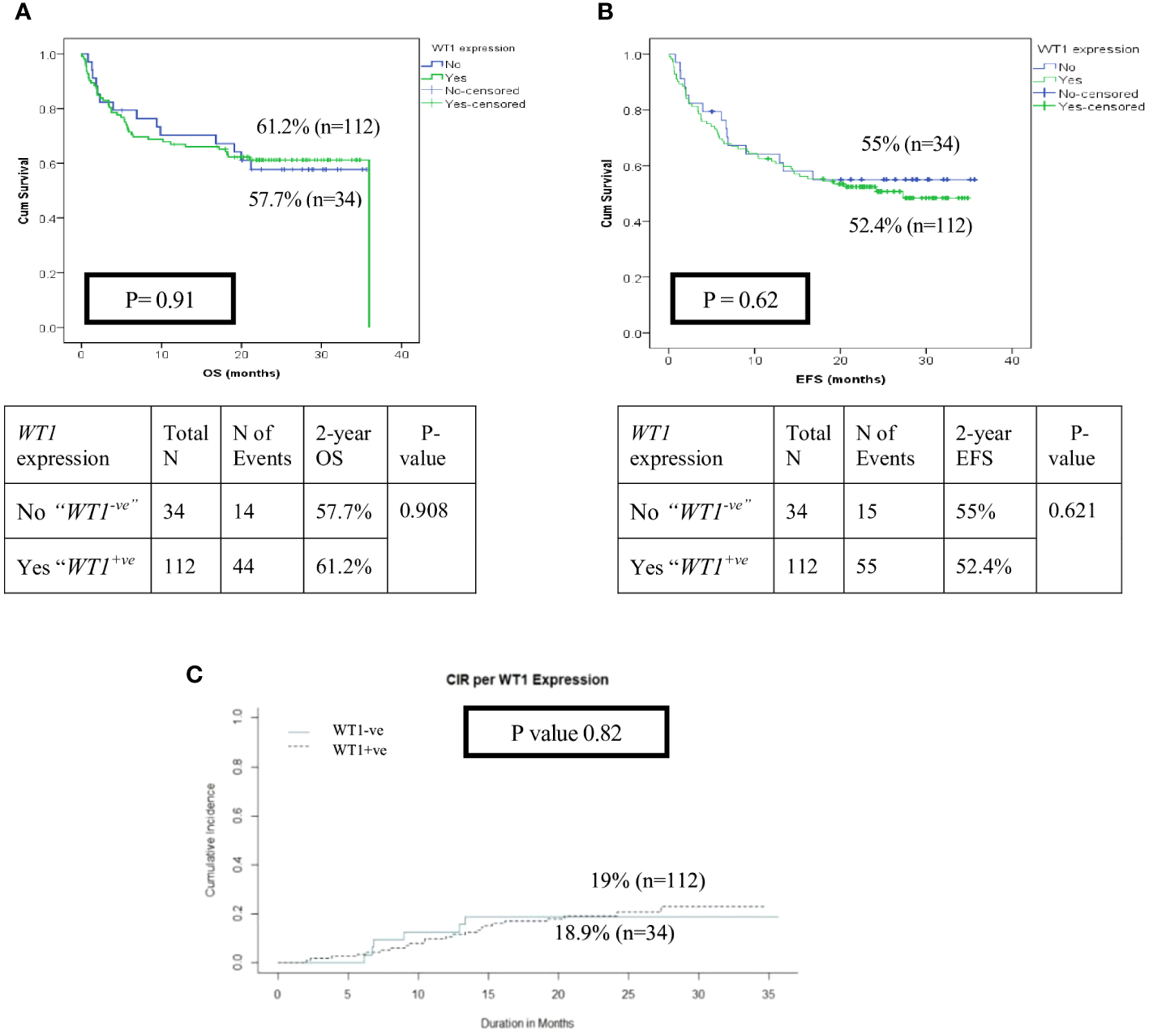 With a median follow-up of 21 months, the overall survival (OS) and the event-free survival (EFS) of the entire cohort at 2 years were 64.5% and 55.3% respectively. HR patients had significantly lower OS, EFS, and higher cumulative incidence of relapse at 2- year (OS; 35.7%, EFS; 12.5% and CIR; 29.4%) than patients in the IR (OS; 51%, EFS; 43.4%, CIR; 21.8%) and LR groups (OS; 85.2%, EFS; 75.2%, CIR; 11%, p<0.001) (Figures 2A–C). There was no significant impact for WT1 overexpression at diagnosis on survival and relapse at 2 years when compared to patients with low WT1 expression level (OS; WT+ve; 61.2% vs WT-ve; 57.7%, p= 0.9), (EFS; WT+ve; 52.4% vs. WT-ve; 55%, p=0.621) (CIR; WT+ve; 19% vs. WT-ve; 18.9%, p=0.82) (Figures 3A–C).