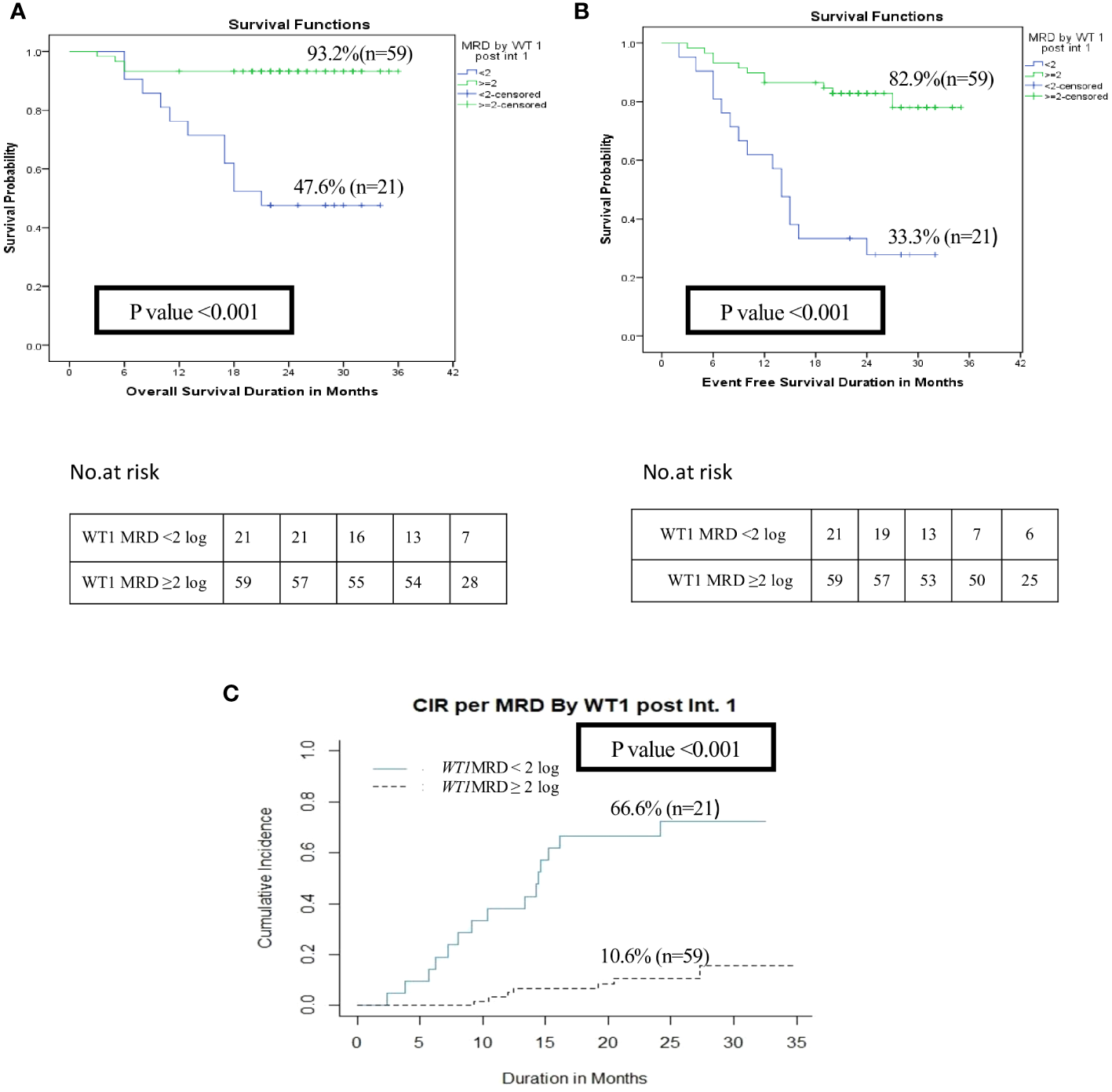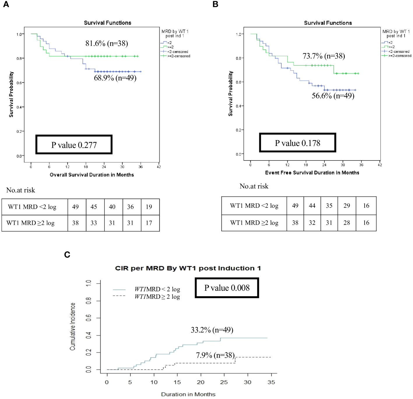 Impact of MRD response by WT1 on the disease outcome of pediatric patients with AML pediatric patients with AML post Induction I (WT1 MRD response <2 log reduction vs ≥ 2log reduction). (A) Overall survival, (B) Event-free survival, (C) Cumulative incidence of relapse (CIR).