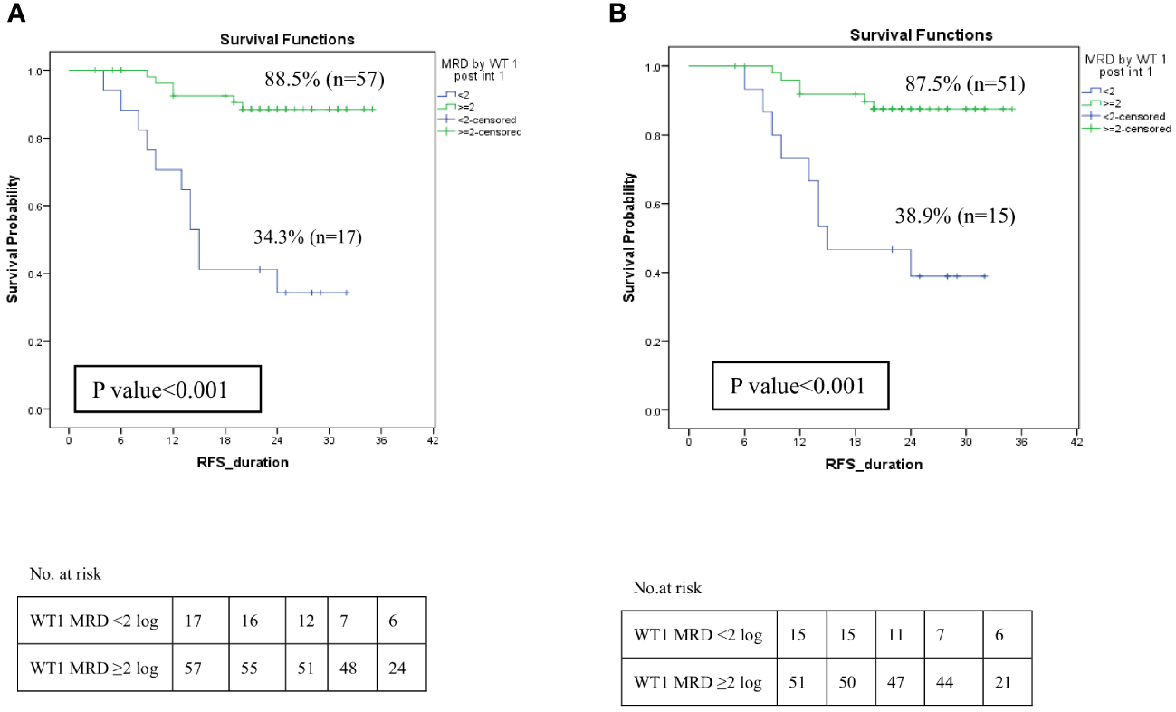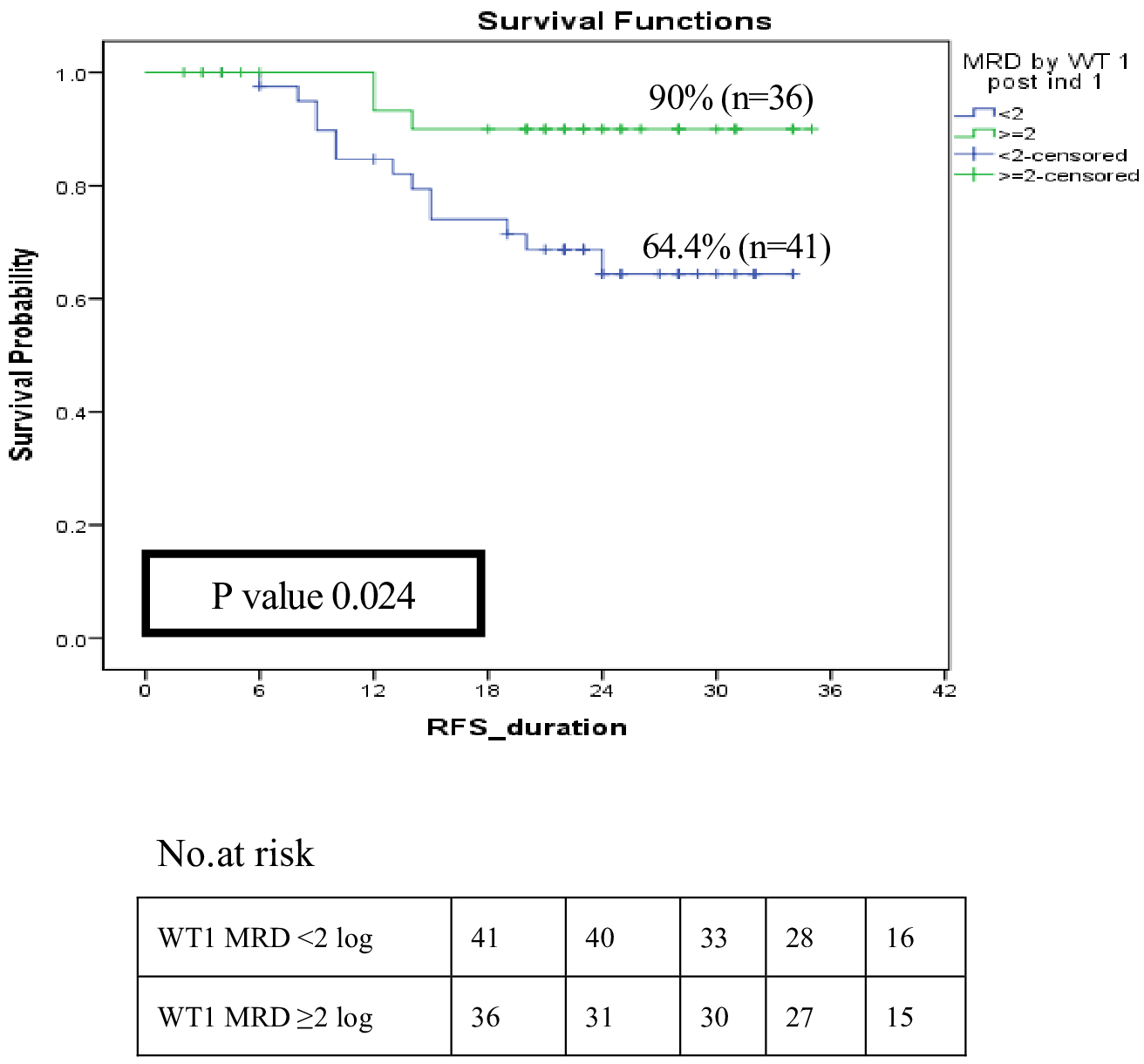 The European Leukemia Network researchers (ELN) validated a quantitative WT1 assay and established reference ranges for WT1 expression in peripheral blood (PB) and bone marrow (BM) by analyzing a large number of control samples. This study showed that (≥2 log) reduction in WT1 transcript after induction predicted reduced relapse risk, also failure to reduce WT1 transcripts below this threshold limits after intensification predicted increased risk of relapse (p=.004) (8). For pediatric AML, Lapillonne et al. observed that WT1 level higher than 50 × 104 after induction was an independent prognostic risk factor of relapse (p=.002) and death (p=.02) (9).