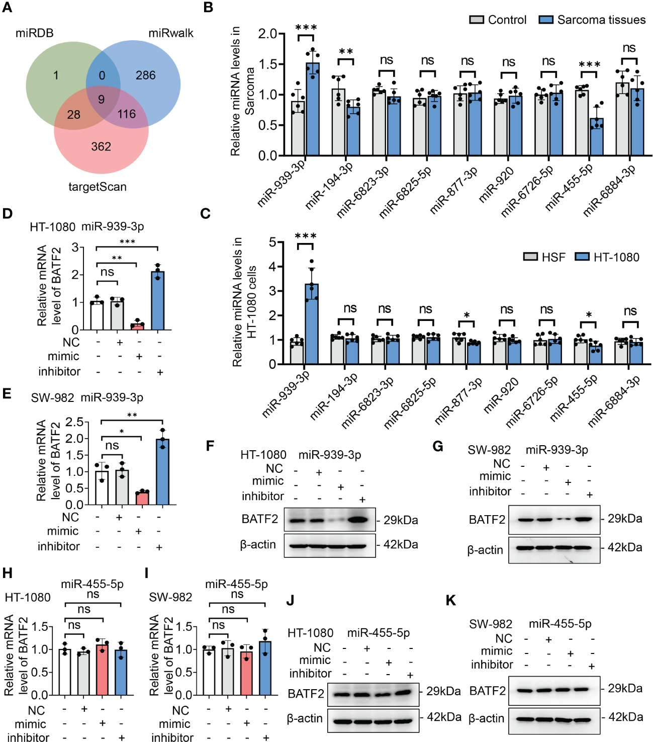BATF2 expression was repressed by miR-939-3p in sarcoma. (A) miRNAs in the 3′-untranslated region (UTR) region of BATF2 were predicted by using miRDB, miRwalk and targetScan software programs, and 9 common miRNAs were found. (B, C) qPCR screening of the predicted 9 miRNAs in control and sarcoma tissues from sarcoma patients (B) and HSF and HT-1080 cells (C). (D–K) qPCR and Western blot analysis of BATF2 expression in HT-1080 cells or SW-982 cells transfected with the mimic or inhibitor of miR-939-3p or miR-455-5p. ns: not significant. *P < 0.05, **P < 0.01, ***P < 0.001.