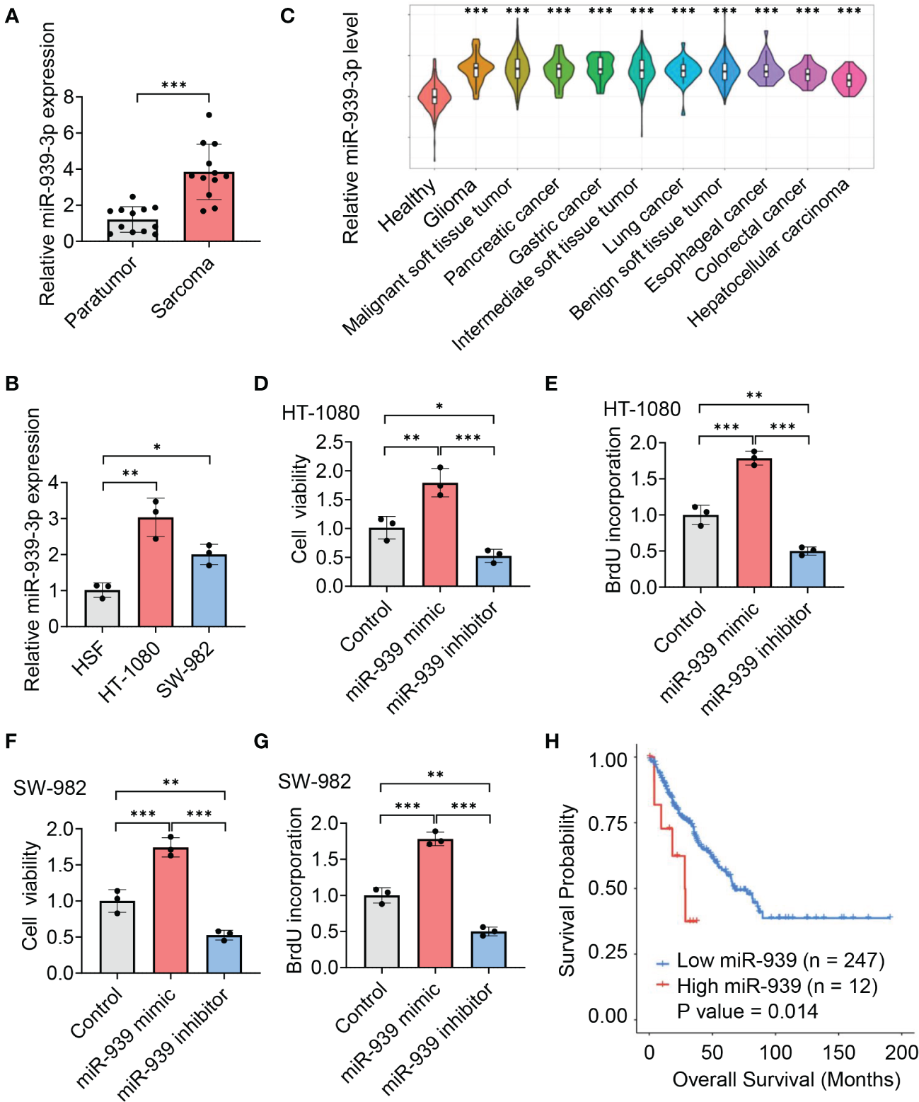 To explore the role of miR-939-3p, we collected sarcoma tissues and observed an elevated expression of miR-939-3p compared to pericarcinoma tissues (Figure 3A). Similarly, sarcoma cell lines (HT-1080 and SW-982) also exhibited higher levels of miR-939-3p compared to a human skin fibroblast cell line (HSF) (Figure 3B). Moreover, circulating miR-939-3p levels were found to be upregulated in sarcoma patients with various histological subtypes, including glioma, malignant soft tissue tumor, pancreatic cancer, gastric cancer, intermediate soft tissue tumor, lung cancer, benign soft tissue tumor, esophageal cancer, colorectal cancer and hepatocellular carcinoma, compared to healthy individuals (Figure 3C).