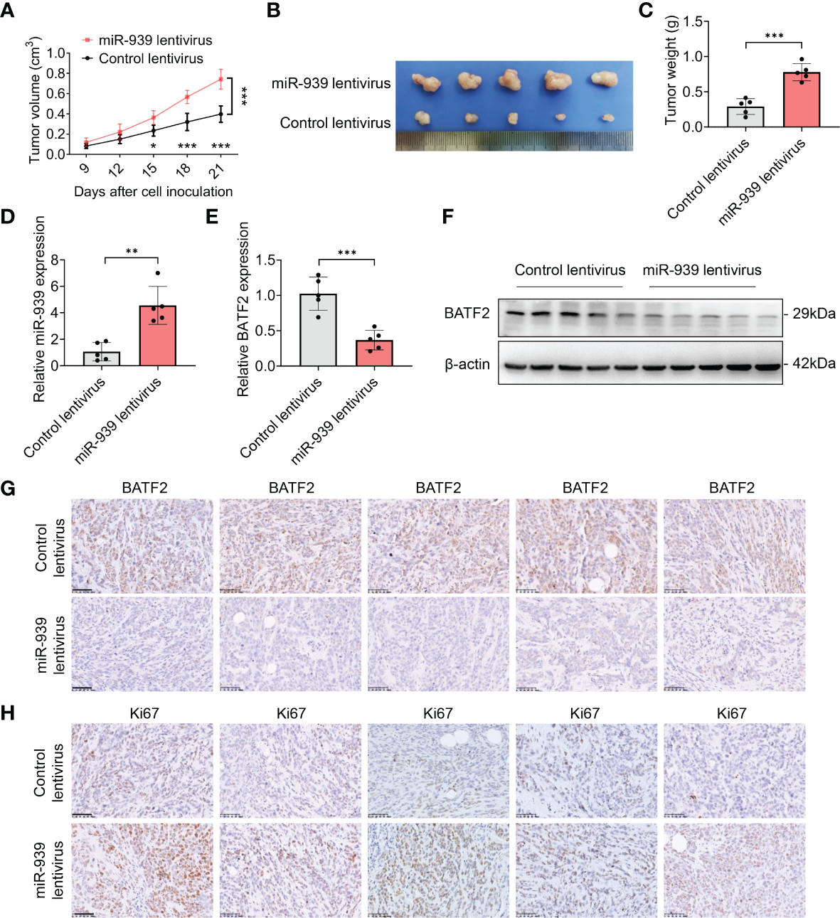 miR-939-3p enhances sarcoma growth in vivo. Xenograft nude mouse models were constructed by subcutaneously injecting 5 × 106 HT-1080 cells stably infected with lentivirus expressing miR-939-3p or control separately (n = 5 per group). (A) The tumor volume was calculated every 3 days, and the mice were sacrificed 21 days after cell inoculation. (B, C) The xenografts were excised for the comparisons of tumor size and weight. (D) qPCR analysis of miR-939-3p expression in the xenografts. (E, F) qPCR and Western blot analyses of BATF2 expression in the xenografts. (G, H) Immunohistochemical analyses of the expressions levels of BATF2 and Ki67 in tumor xenografts. n = 5 per group. Data are expressed as mean ± SD. *P < 0.05, **P < 0.01, ***P < 0.001.