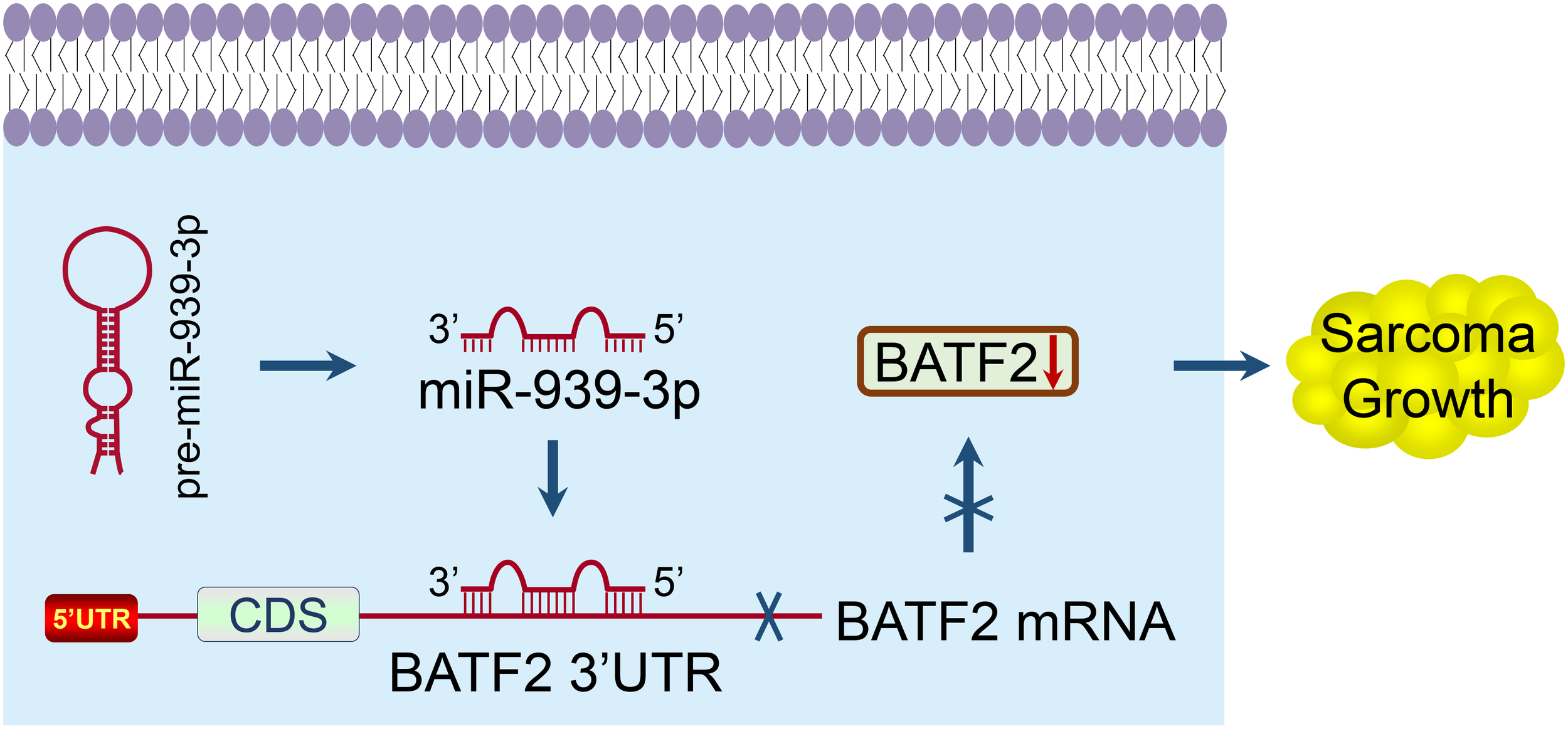 A proposed model elucidating the mechanism of miR-939-3p-induced sarcoma proliferation and poor prognosis through suppressing BATF2 via directly binding to its 3’ UTR.