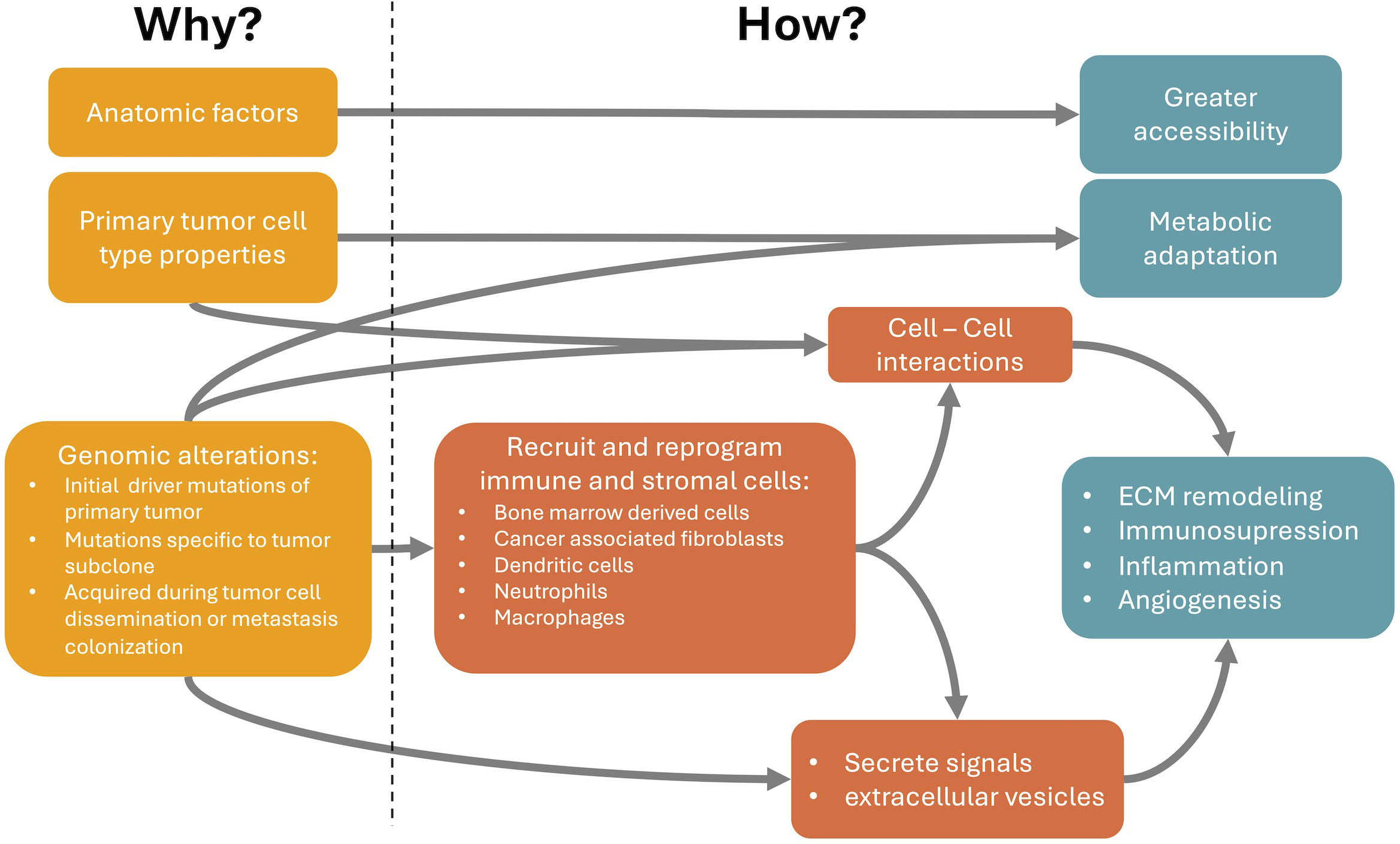 Relationship between the causes (Why it happens) and the cellular and molecular mechanisms of metastasis organotropism (How it happens). Anatomic relations between primary tumor and metastasis locations partially explain organotropism patterns through a facilitated accessibility of circulating tumor cells (CTCs) to particular metastatic locations. Properties of the primary tumor cell type, even before changes induced by tumorigenesis, can already explain a better metabolic adaptation or intercellular communication at the preferred metastatic niches. Finally, genomic alterations, such as mutations and copy number variations, can occur in the initial primary tumor development, subsequently in specific subclones of the primary tumor or are only acquired during tumor cell dissemination or metastasis colonization. These genomic alterations can modify cancer cell properties and favor specific metastatic locations through the secretion of tumor-derived signals or extracellular vesicles that can recruit and reprogram immune and stromal cells at the metastatic site, even before the arrival of CTCs. These reprogrammed cells can be, for example, bone marrow derived cells, cancer associated fibroblasts, dendritic cells, neutrophils or macrophages. They become pro-metastatic and induce processes like extracellular matrix (ECM) remodeling, immunosuppression, inflammation and angiogenesis. These processes facilitate the arrival and survival of CTCs at the metastatic niche.