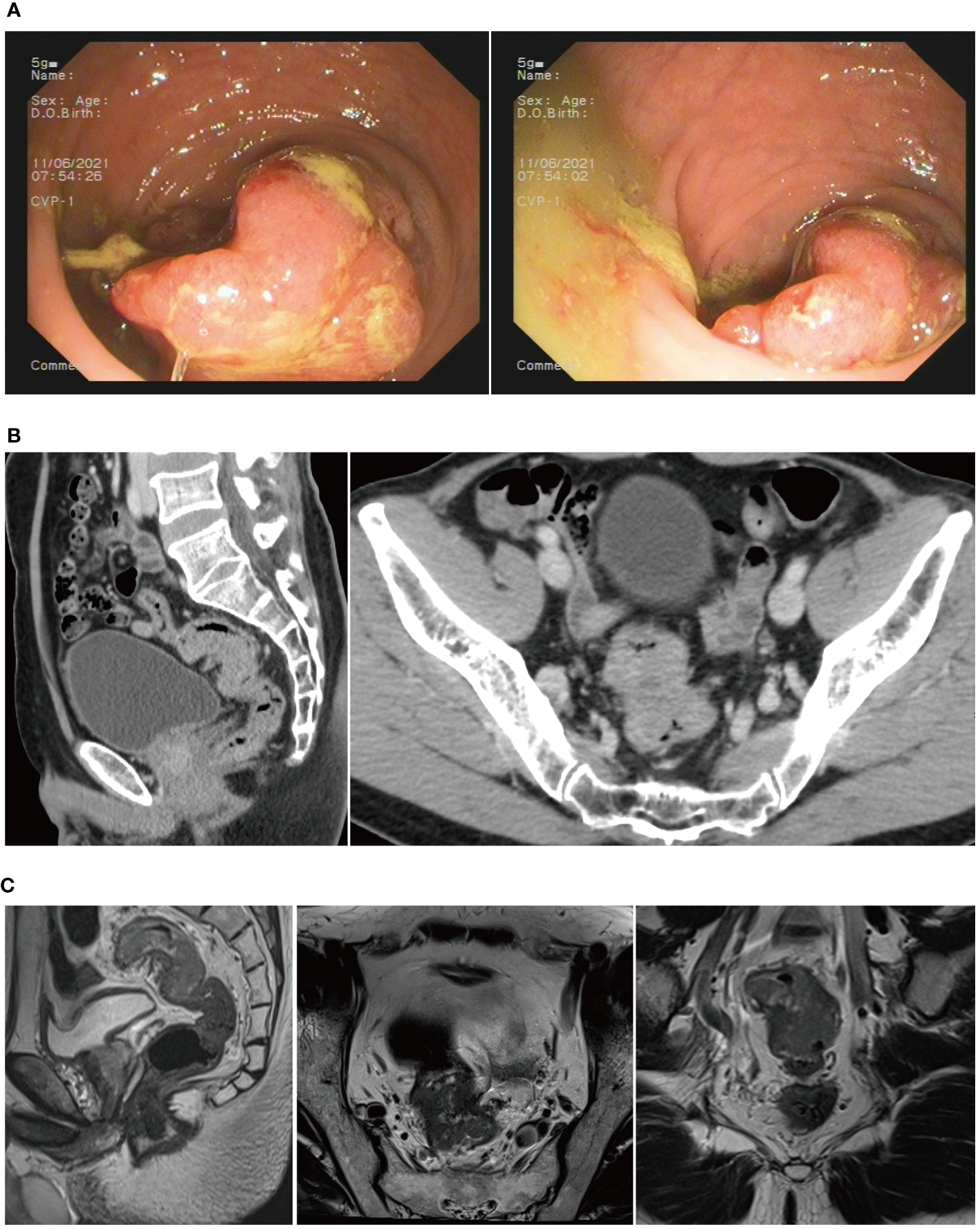 (A) Colonoscopy revealed a rectal cauliflower-like neoplasm. (B) CT scans showed a tumor-like lesion in the rectum. (C) MRI suggested rectal cancer.