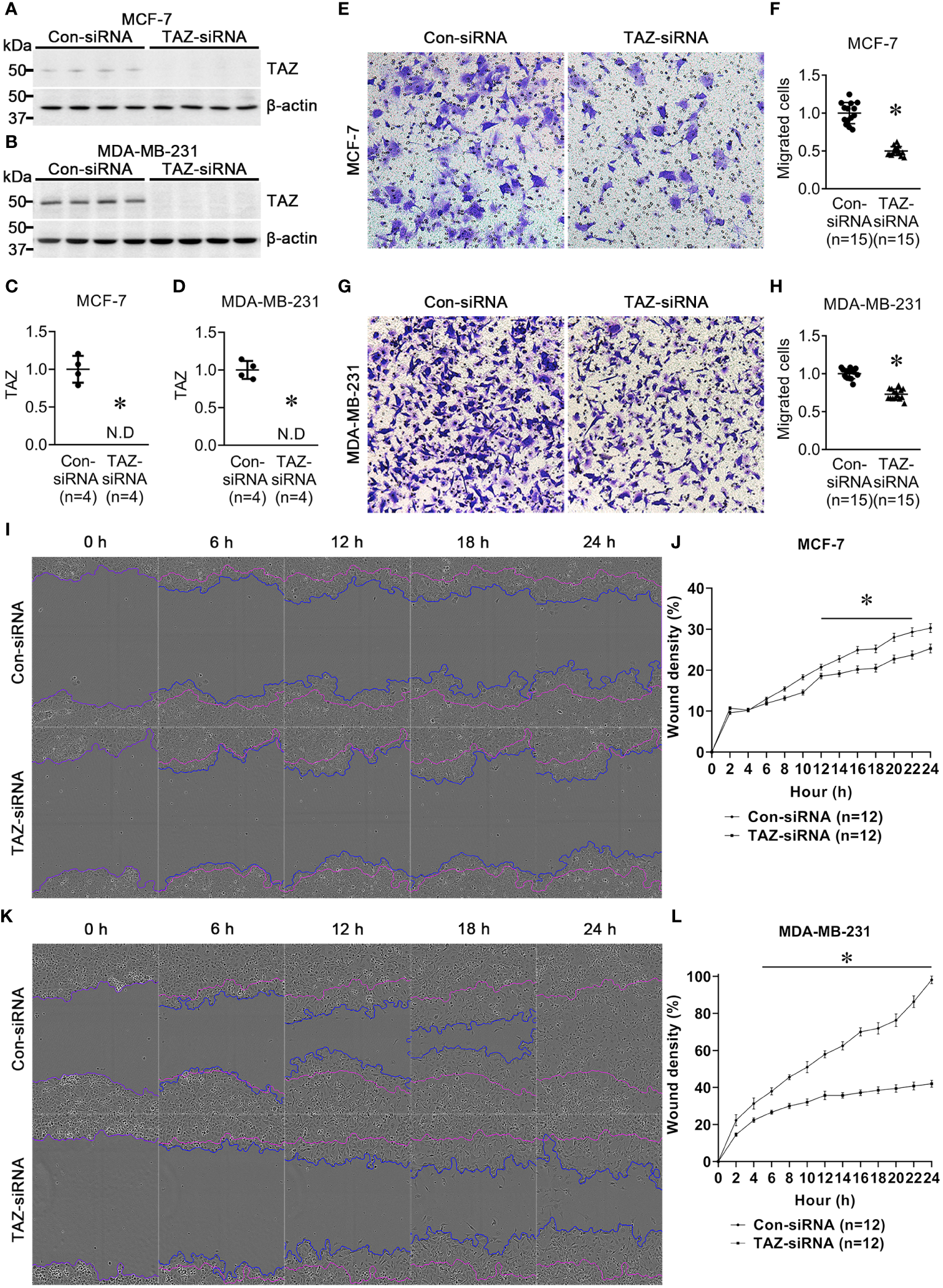 Semiquantitative immunoblotting of TAZ and cell migration assay in breast cancer cells (MCF-7 and MDA-MB-231) treated with control-siRNA or TAZ-siRNA. (A–D) Changes in protein abundance of TAZ in breast cancer cells treated with control-siRNA or TAZ-siRNA for 24 hours. *P < 0.05, when compared with control-siRNA. The immunoblots were reacted with antibodies against TAZ (~49 kDa) and β-actin (~42 kDa). n indicates the number of cell preparation in each group. (E–H) Transwell cell migration assay of breast cancer cells treated with control-siRNA or TAZ-siRNA. The numbers of migrated cells were counted in the randomly selected fields (x100) per well. n indicates the number of randomly selected fields in each group. *P < 0.05, when compared with control-siRNA. (I–L) Scratch wound healing assay. *P < 0.05, when compared with control-siRNA. n indicates the number of wells containing cell treated with control-siRNA or TAZ-siRNA.