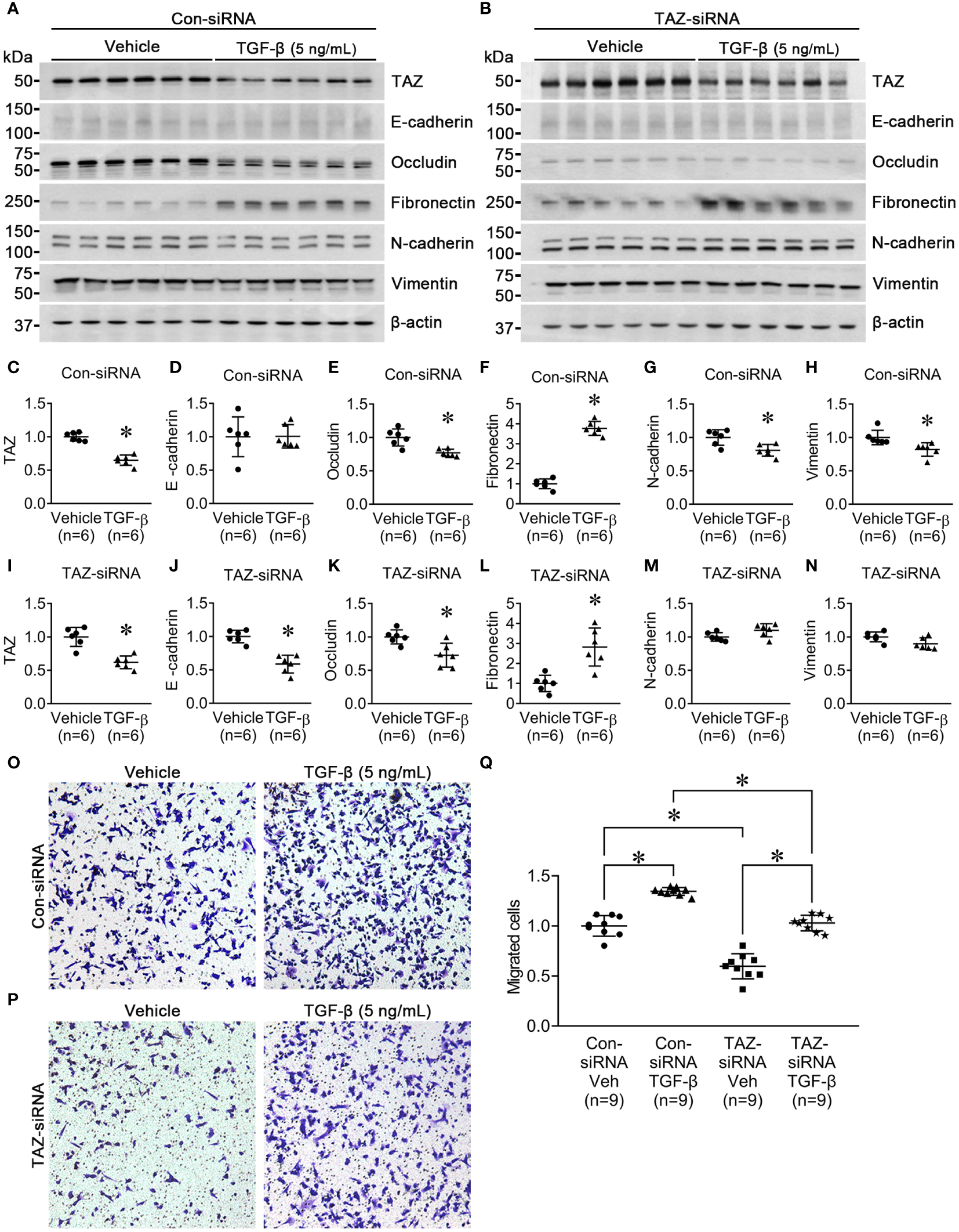 Semiquantitative immunoblotting for the studies of TGF-β treatment. (A, C–H) Semiquantitative immunoblotting of TAZ, E-cadherin, occludin, fibronectin, N-cadherin, vimentin, and β-actin in MDA-MB-231 cells treated with vehicle or TGF-β (5 ng/ml) under control-siRNA treatment. The immunoblots were reacted with antibodies against TAZ (~49 kDa), E-cadherin (~135 kDa), occludin (~65 kDa), fibronectin (~262 kDa), N-cadherin (~125 kDa), vimentin (~57 kDa), and β-actin (~42 kDa). (B, I–N) Semiquantitative immunoblotting of TAZ, E-cadherin, occludin, fibronectin, N-cadherin, vimentin, and β-actin in MDA-MB-231 cells treated with vehicle or TGF-β (5 ng/ml) under TAZ-siRNA treatment. *P < 0.05, when compared with vehicle. n indicates the number of cell preparation in each group. Transwell cell migration assay of MDA-MB-231 cells treated with vehicle or TGF-β (5 ng/ml) under control-siRNA (O) or TAZ-siRNA treatment (P). (Q) The numbers of migrated cells were counted in the randomly selected fields (x100) per well. n indicates the number of randomly selected fields in each group. *P < 0.05.