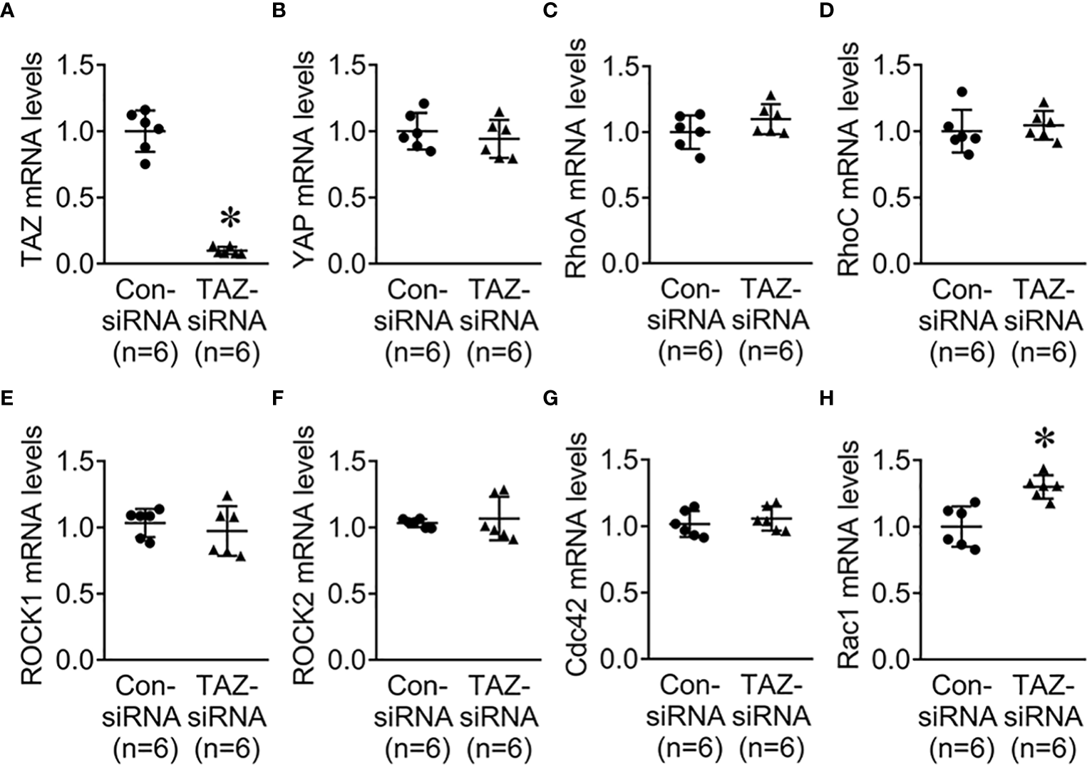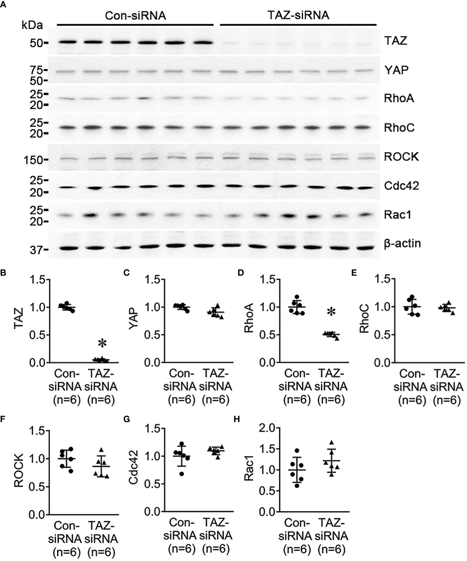 Human breast cancer cell lines [MCF-7 (HTB-22) and MDA-MB-231 (HTB-26)] were purchased from the American Type Culture Collection (ATCC, Manassas, VA). MCF-7 cells were maintained in high glucose Dulbecco’s Modified Eagle’s Medium (DMEM, 25 mM glucose), while MDA-MB-231 cells were cultured in low glucose DMEM (5.5 mM glucose) at 37°C. Both media contained 0.1% penicillin-streptomycin and 10% heat-inactivated fetal bovine serum (FBS). Cells were incubated in a humidified incubator at 37°C and 5% CO2. MCF-7 cells and MDA-MB-231 cells were seeded on 6- or 12-well plates and transfected with small interfering RNA (siRNA) specific for TAZ, using siGENOME human WWTR1 siRNA (M-016083-00-0010, Dharmacon; Horizon Discovery, Cambridge, UK), siGENOME human RHOA siRNA (M-003860-03-0010, Dharmacon; Horizon Discovery, Cambridge, UK), and DharmaFECT4 (T-2004-03, Dharmacon; Horizon Discovery, Cambridge, UK). To isolate proteins from the cells for performing immunoblotting, cells were lysed with Laemmli buffer (10 mM Tris-HCl, 1.5% SDS, pH 6.8), containing protease and phosphatase inhibitors (0.4 μg/mL leupeptin, 0.1 mg/mL pefabloc, 1 mM Na3VO4, 24 mM NaF, and 0.1 μM okadaic acid). Total RNA was extracted using Direct-zol RNA MiniPrep (R2050, Zymo Research, Irvine, CA) following the manufacturer’s instructions for quantitative real-time PCR (qRT-PCR).
