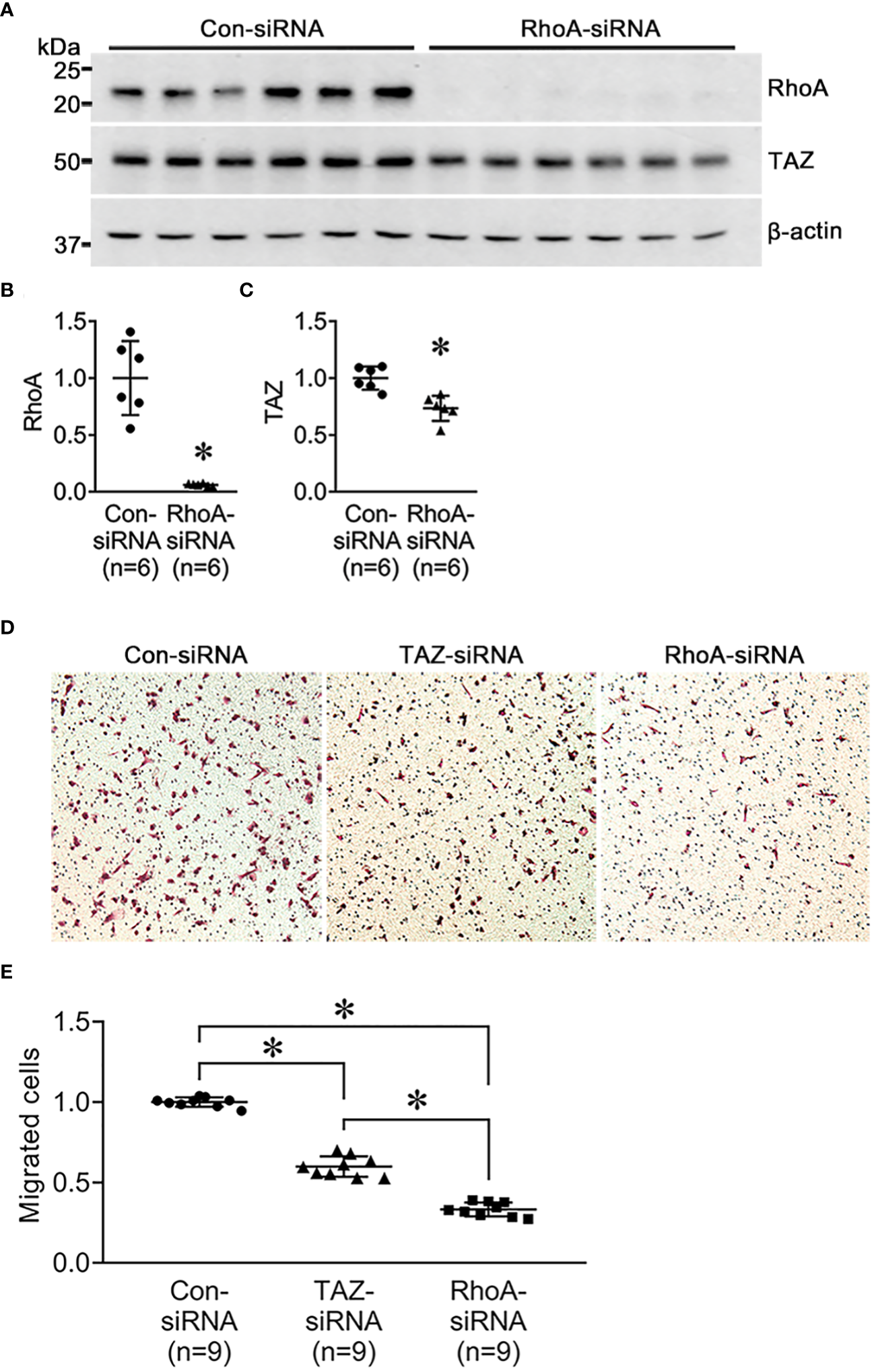 TAZ knockdown inhibits the migration of breast cancer cells by regulating the intracellular actin cytoskeletal organization. This is achieved, in part, by reducing the abundance of RhoA and Rho-dependent downstream kinase proteins, which results in actin depolymerization and the disassembly of stress fibers and focal adhesions.