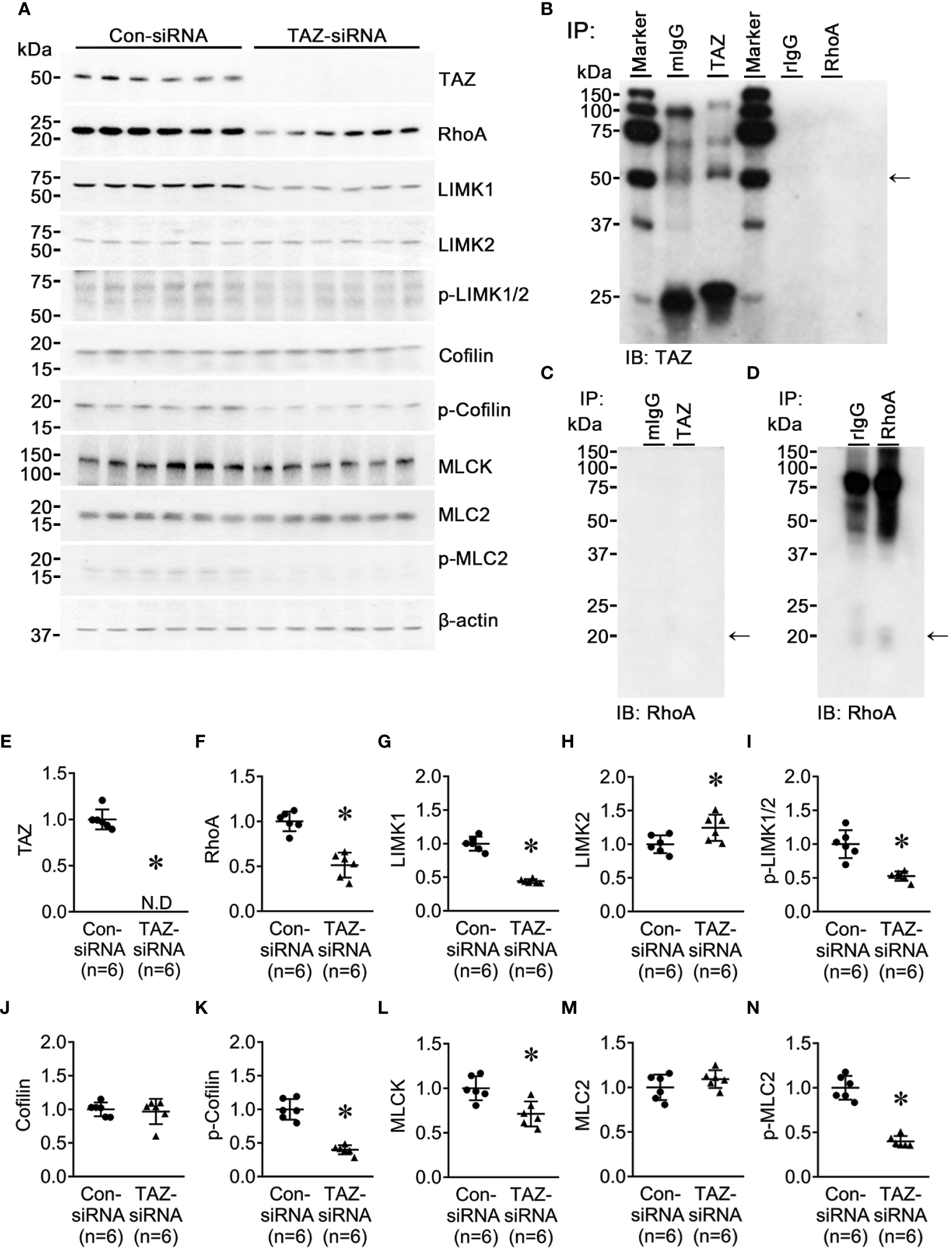 TAZ-siRNA treatment reduced TAZ abundance in MCF-7 and MDA-MB-231 breast cancer cells, which was associated with a significant decrease in cell migration. TAZ knockdown increased the expression of fibronectin, but it did not exhibit the typical pattern of EMT progression. TGF-β treatment in MDA-MB-231 cells resulted in a reduction in TAZ and an increase in fibronectin levels. However, it paradoxically promoted cell migration, suggesting that EMT is unlikely to be involved in the decreased migration of breast cancer cells in response to TAZ suppression. RhoA, a small Rho GTPase protein, was significantly reduced in response to TAZ knockdown. This caused a decrease in the expression of the Rho-dependent downstream pathway, i.e., LIM kinase 1 (LIMK1), phosphorylated LIMK1/2, and phosphorylated cofilin, leading to actin depolymerization. Furthermore, myosin light chain kinase (MLCK) and phosphorylated MLC2 were significantly decreased in MDA-MB-231 cells with TAZ knockdown, inhibiting the assembly of stress fibers and focal adhesions.