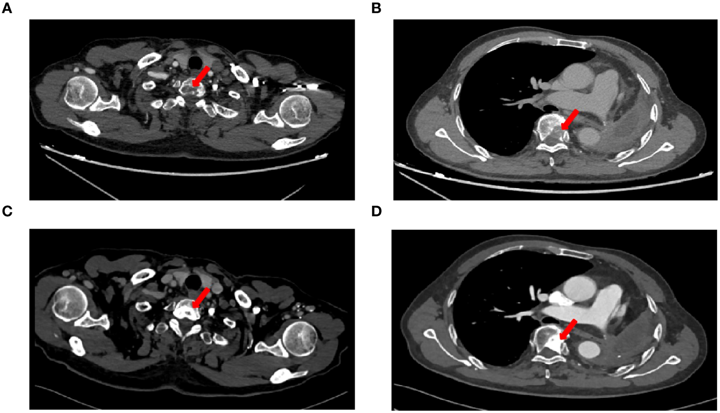 CT imaging changes before and after treatment. (A) Chest CT images on 23 July, 2019 showed T1 vertebral metastasis, (B) Chest CT images on 23 July, 2019 showed T6 vertebral metastasis, (C) Chest CT images showed osteogenic changes of T1 vertebral metastasis after radiotherapy, (D) Chest CT images showed osteogenic changes of T6 vertebral metastasis after radiotherapy.