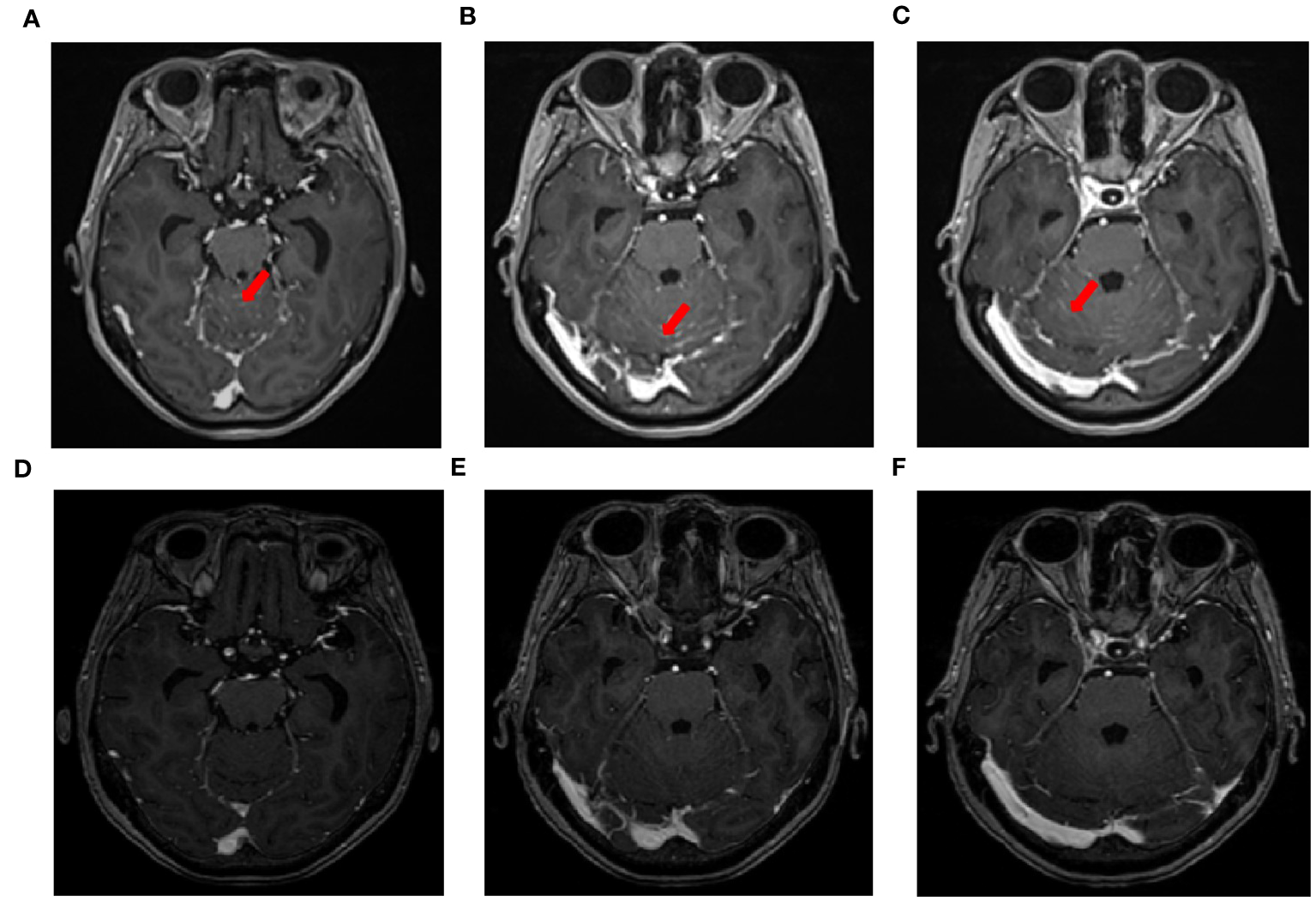 MRI changes in leptomeningeal metastasis before and after treatment. (A–C) MRI images of leptomeningeal metastasis in September 2021 showing significant thickening and pronounced enhancement of the meninges in the cerebellum. (D–F) After three courses of intrathecal chemotherapy, the thickening and pronounced enhancement of the meninges in the cerebellum disappeared.