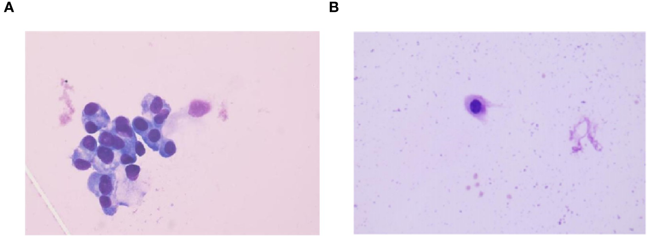 CSF cytology findings before and after treatment. (A) CSF cytology findings in September 2021 reveal tumor cells (HE staining,×100). (B) CSF cytology showing reactivity changes after three courses of intrathecal chemotherapy (HE staining,×100).