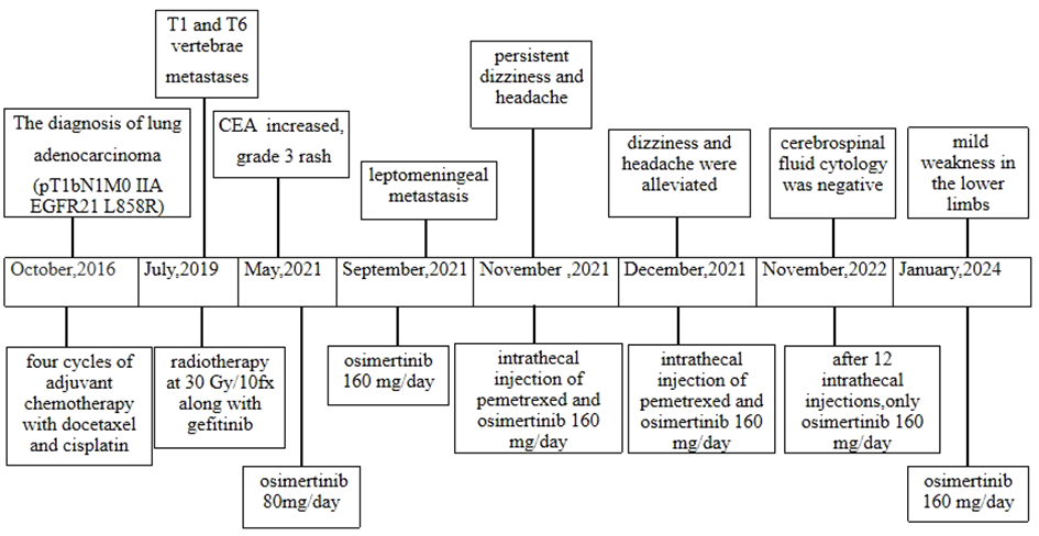 Osimertinib is a third-generation irreversible epidermal growth factor receptor tyrosine kinase inhibitor (EGFR-TKI) that effectively and selectively inhibits EGFR-TKI-sensitizing and EGFR T790M mutations. High doses of osimertinib exhibit high BBB penetration rates. The BLOOM phase I study demonstrated that a doubled dose of osimertinib (160 mg/day) exhibits significant efficacy in NSCLC patients with EGFR-mutant LM, with an objective response rate of 41%, a median progression-free survival (PFS) of 8.6 months and a median OS of 11 months (5). Although the incidence of adverse reactions has increased, osimertinib has shown significant therapeutic efficacy and manageable safety. Pemetrexed is a cell cycle-specific antimetabolite antineoplastic drug that inhibits folate metabolism and is a multitarget antifolate agent. It is considered the primary treatment option for advanced lung adenocarcinomas. However, the CSF penetration rate of pemetrexed is extremely low, accounting for less than 2% of plasma levels (6). Intrathecal chemotherapy (IC) is a viable approach for treating LM; its advantage is that it can directly penetrate the blood-CSF barrier and maximize drug exposure in the CSF. A direct intrathecal injection of pemetrexed has demonstrated effectiveness in the treatment of LM (7). Currently, there is limited literature available regarding the intrathecal injection of pemetrexed for the treatment of LM in NSCLC. Here we present a case report of lung adenocarcinoma with an EGFR mutation, who developed meningeal metastasis and received double-dose osimertinib combined with intrathecal injection of pemetrexed to enhance therapeutic efficacy.