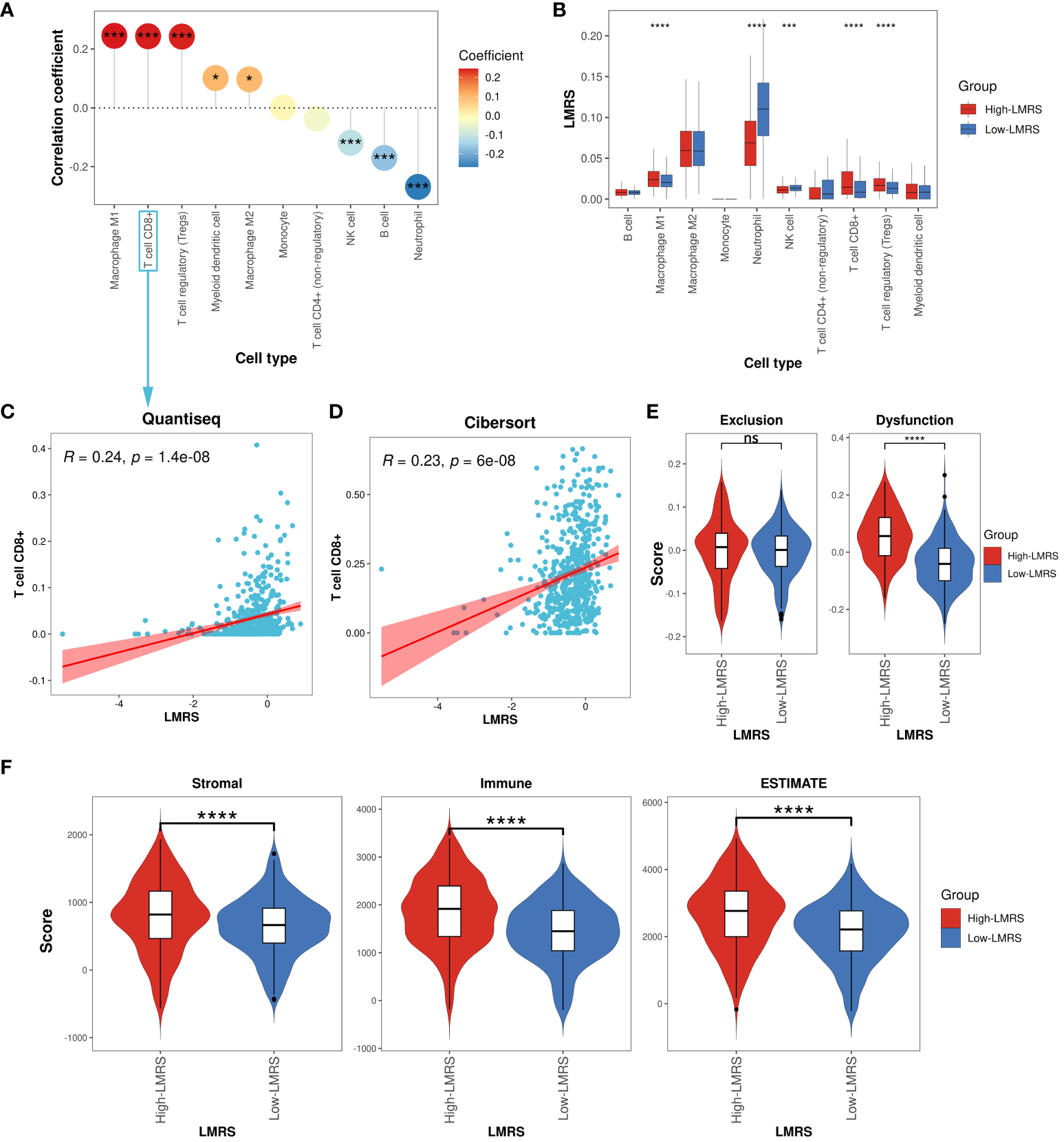 Immune landscape of different LMRS groups. (A) Correlation analysis between LMRS and immune cell infiltration levels. (B) Comparison of immune cell infiltration levels between different LMRS groups. (C) Correlation analysis between LMRS and T cell CD8+ infiltration levels evaluated by the quantiseq. (D) Correlation analysis between LMRS and T cell CD8+ infiltration levels evaluated by the cibersort algorithm. (E) Comparison of exclusion score and dysfunction score between different LMRS groups (ns, non-significant; ****, p value< 0.0001). (F) Comparison of stromal score, immune score, and estimate score between different LMRS groups (****, p value< 0.0001). '*' indicates that the p-value is less than 0.05, and '***' indicates that the p-value is less than 0.001.