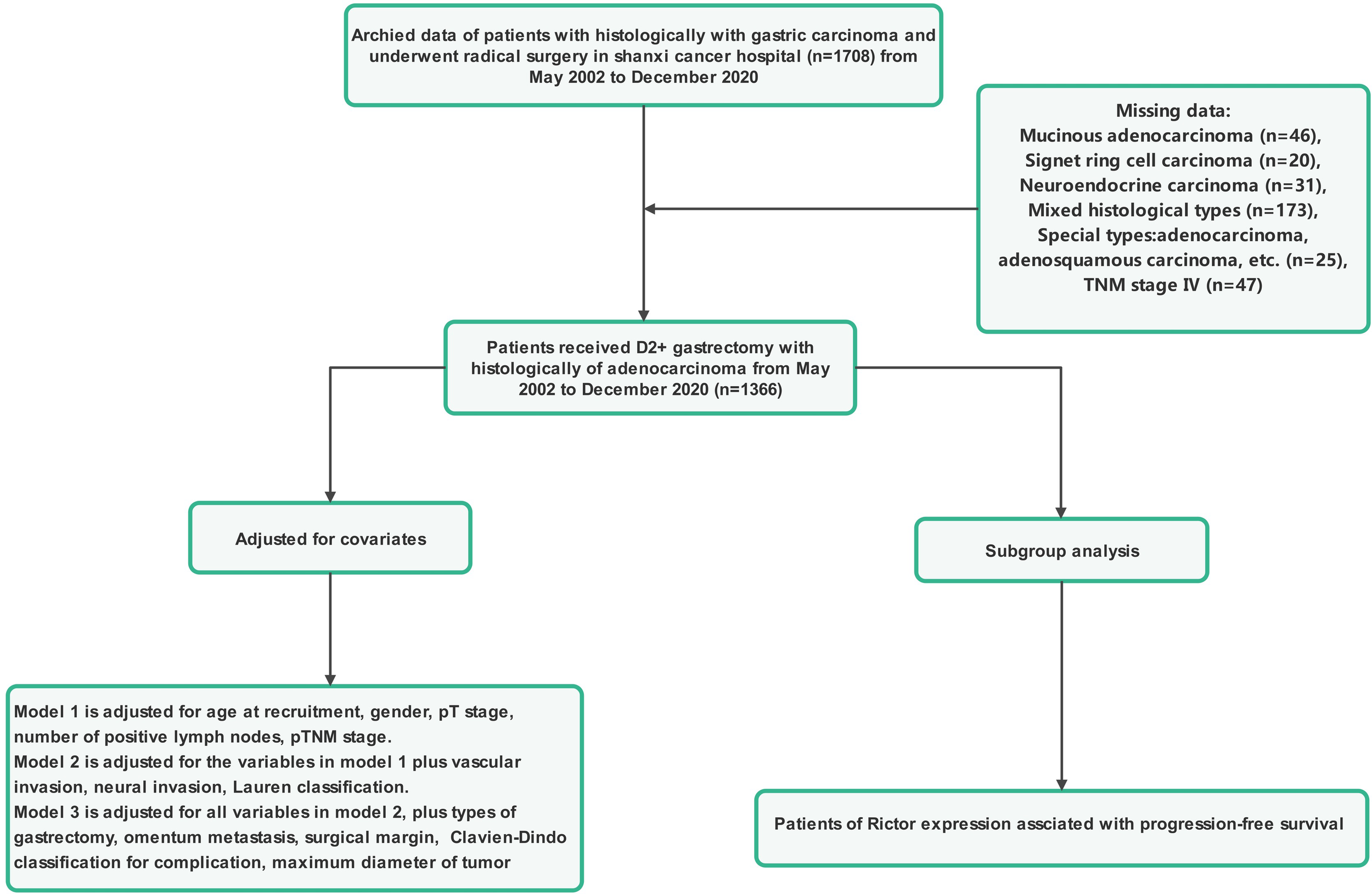 However, it is essential to note that the survival of patients varied widely, showing significant discrepancies between them. As a result, we decided to initiate risk stratification after Rictor expression based on their prediction model. We aim to develop nomograms model that can accurately predict the 3-year and 5-year progression-free survival (PFS) rates for Rictor protein-positive and negative cases, respectively. This model will allow for risk stratification, enabling us to identify patients who would benefit from targeted therapy for Rictor protein-positive cases and those who should avoid unnecessary overtreatment. We aim to provide precise treatment guidance for postoperative gastric adenocarcinoma patients by adopting a precision medicine approach. Ultimately, our goal is to achieve individualized treatment strategies and enhance the effectiveness of personalized therapy.