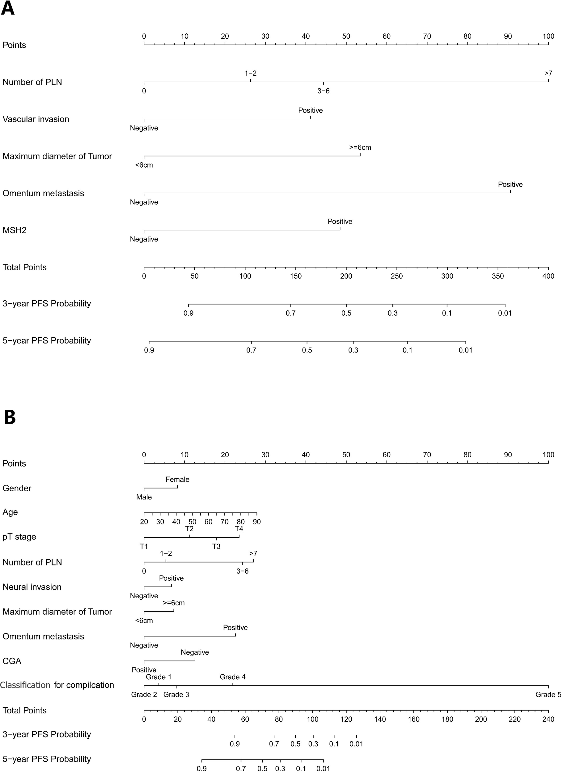 Developing nomogram-based risk stratification model to determine 3-year and 5-year progression-free survival (PFS) and to identify high-risk patients with gastric adenocarcinoma based on different Rictor statuses.