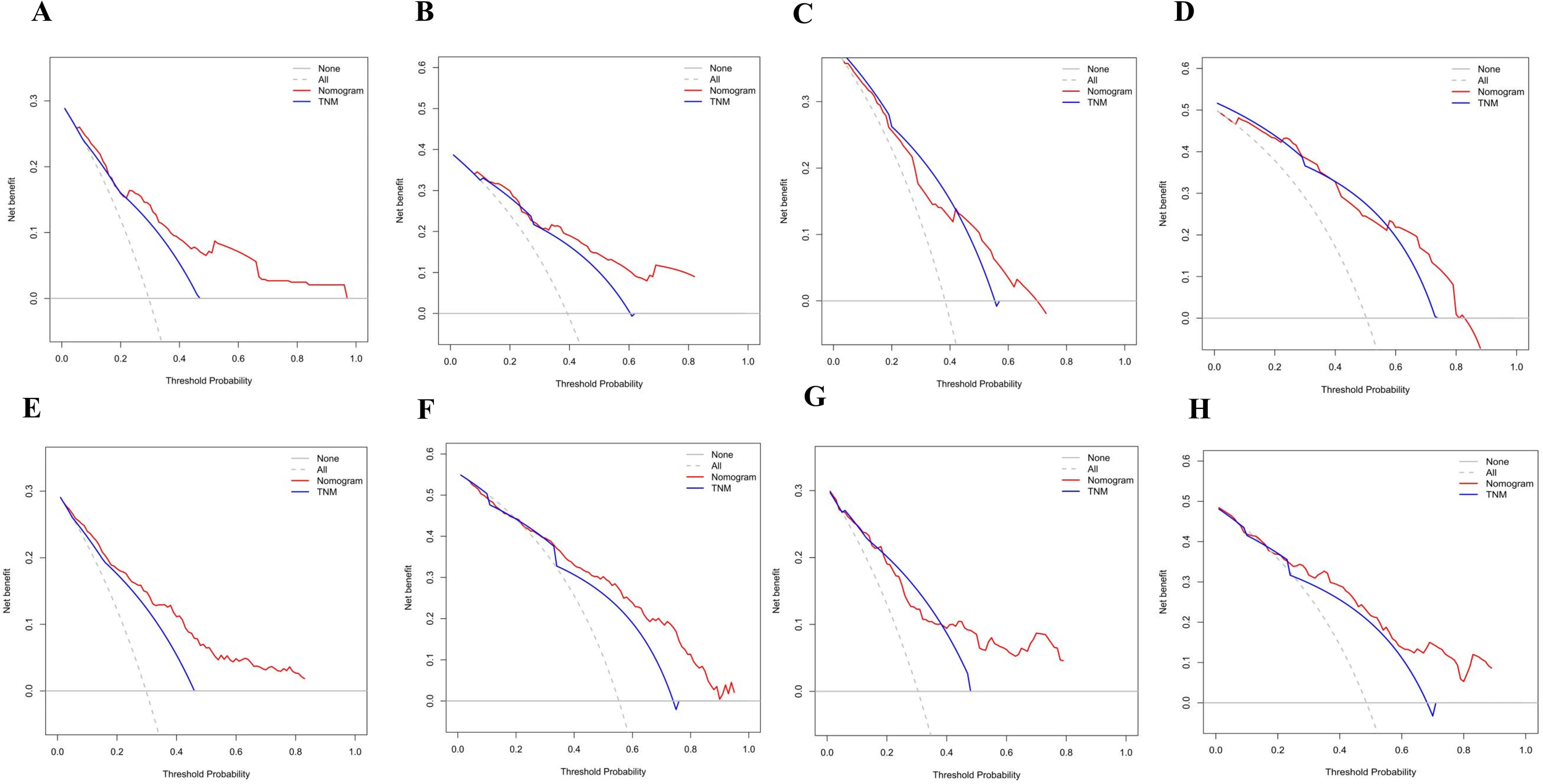 The Rictor (-) nomogram for predicting PFS included variables such as age, number of positive lymph nodes, vascular invasion, maximum diameter of the tumor, omentum metastasis, and expression of MSH2. In the internal validation, the C-index of the Rictor (-) nomogram was 0.760 (95%CI: 0.720-0.799), which was superior to the C-index of the American Joint Committee on Cancer (AJCC) 8th edition TNM staging (0.683, 95%CI: 0.646-0.721). Similarly, the Rictor (+) nomogram for predicting PFS included variables such as gender, age, pT stage, number of positive lymph nodes, neural invasion, maximum diameter of the tumor, omentum metastasis, Clavien-Dindo classification for complications, and CGA expression. The C-index of the Rictor (+) nomogram was 0.795 (95%CI: 0.764-0.825), which outperformed the C-index of the AJCC 8th edition TNM staging (0.693, 95%CI: 0.662-0.723). The calibration curves, t-ROC curves, and decision curve analysis for both nomogram models demonstrated their excellent prediction ability.