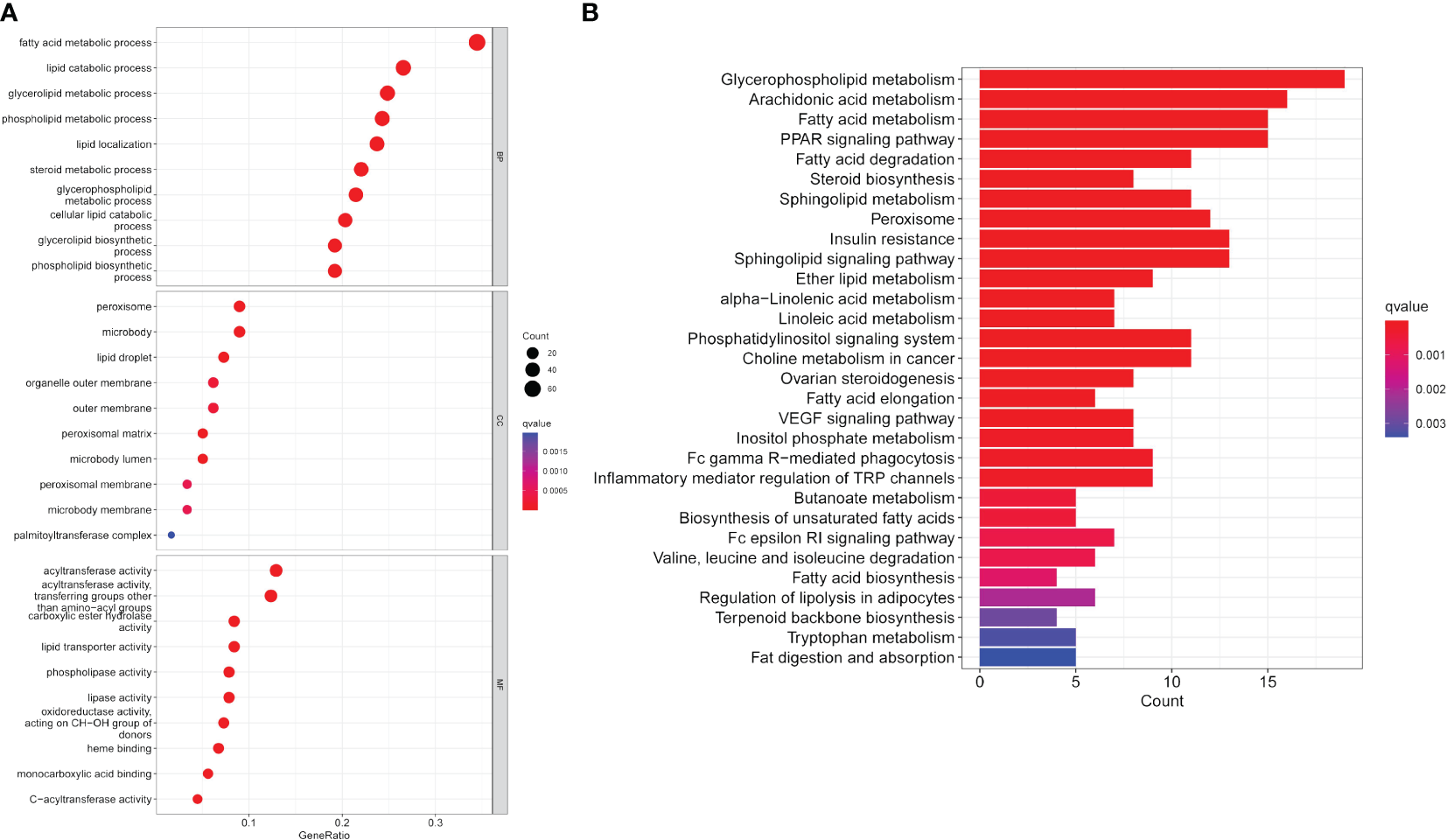 GO enrichment analysis of LMRGs in CC revealed significant enrichment across molecular functions, biological processes, and cellular components. Specifically, LMRGs exhibited notable enrichment in fatty acid metabolism and lipid catabolism in biological processes. In terms of cellular components, LMRGs were primarily concentrated in peroxisomes and lipid droplets. Furthermore, molecular function analysis indicated enrichment in acyltransferase and carboxylate hydrolase activity (Figure 2A). Moreover, KEGG analysis suggested that these genes were mainly concentrated in glycerophosphate metabolic pathway, arachidonic acid metabolic pathway, fatty acid metabolic pathway and PPAR (peroxisome proliferator activated receptor) signal pathway (Figure 2B).