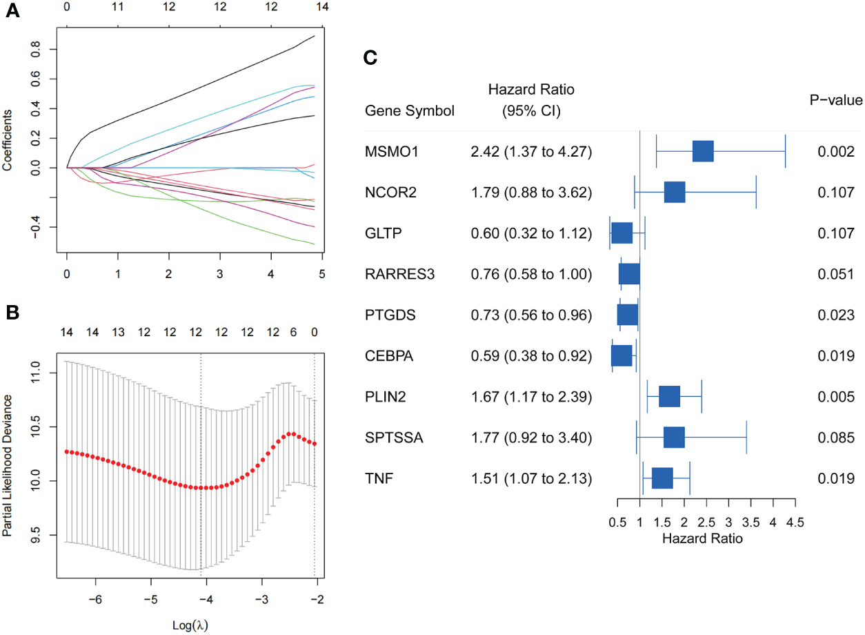 Screening of LMR-DEGs with prognostic significance in training set. (A) Trajectories of variable coefficients in LASSO regression. (B) LASSO regression cross-validation parameter selection process. (C) Forest plot of 9 LMR-DEGs by Multivariate Cox regression analysis.