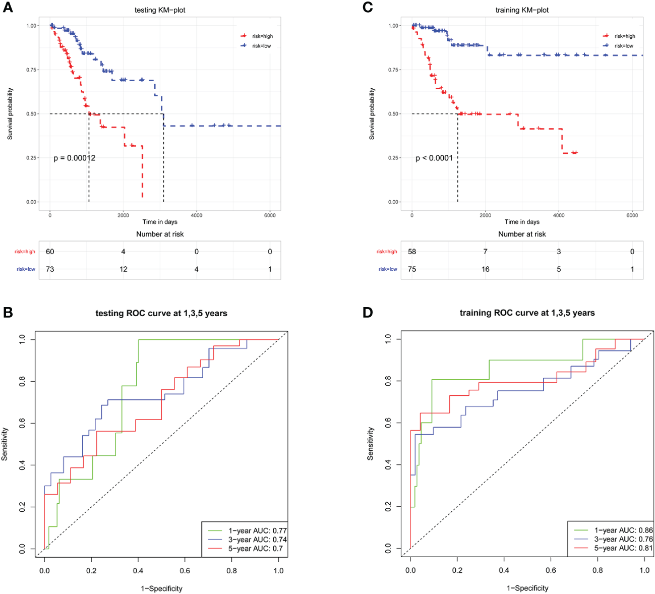 Patients in the training cohort were classified into high-risk and low-risk groups according to the median riskScore. The Kaplan-Meier analysis showed that patients in the low-risk group had a significantly higher OS than those in the high-risk group (Figure 4A, P<0.0001). Moreover, the area under the Receiver operating characteristic (ROC) (AUCs) revealed that this prognostic model has a high predictive value in training cohort, with AUCs values of 1, 3 and 5 years were 0.86, 0.76, and 0.81 (Figure 4B). Then the prognostic riskScore formula was applied to the testing cohort, showing similar results to the training cohort (Figures 4C, D).