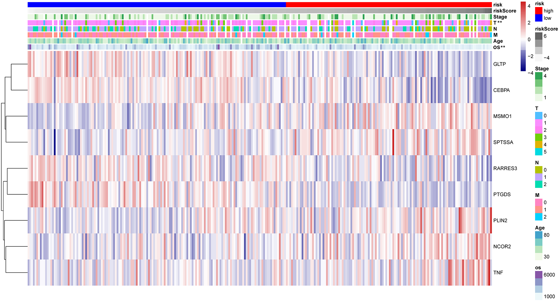 The HPA database was utilized for immunohistochemical analysis of genes, although SPTSSA and RARRES3 were not available in the database. As depicted in Figure 7, PTGDS and TNF were not found to be significantly expressed in CC cells. The expression trends of the remaining genes were consistent with our findings. The Kaplan–Meier survival curves also confirmed that higher expression of MSMO1, NCOR2, PLIN2, SPTSSA and TNF and lower expression of GLTP, RARRES3, PTGDS and CEBPA were associated with worse OS in the TCGA dataset (Figures 8A–I). We constructed a heatmap containing gene expression patterns and clinicopathological factors (Figure 9). Once again, the gene expression pattern corroborated our earlier analyses. We did not find statistically significant differences between riskScore and N stage, M stage, FIGO Stage and age. However, we noted that higher riskScore were associated with a higher T stage and poorer OS. Functional analysis of these 9 genes was performed using the GO and KEGG databases. The results indicated that these genes are enriched in pathways related to lipid metabolism (Figure 10).