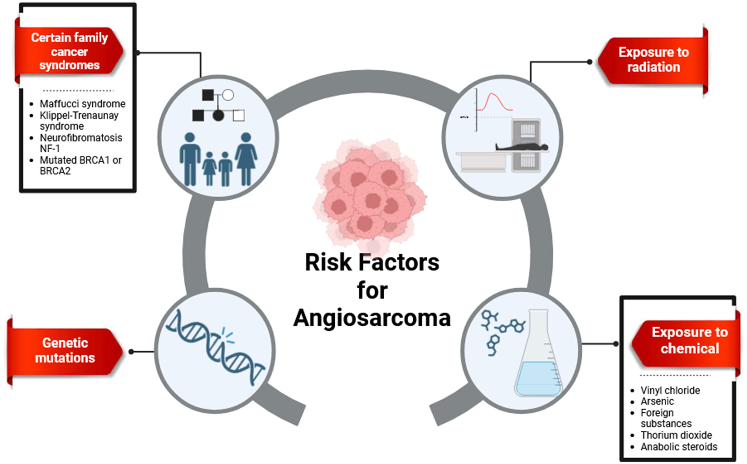 The etiology of angiosarcoma remains unclear; however, several well-established risk factors have been identified. These include exposure to radiation, chronic lymphedema, and carcinogens such as thorium dioxide, vinyl chloride, and arsenic. Genetic disorders also contribute to the constellation of risk factors for angiosarcoma (31, 32), as illustrated in Figure 1.