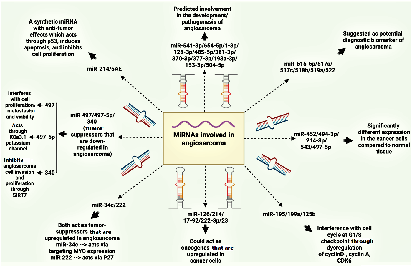 The expanding role of miRNAs in cancer diagnosis, prognosis, and therapy has spurred research into their potential applications in angiosarcoma (94). Several miRNAs have emerged as candidates for angiosarcoma biomarkers. Upregulation of miR-541-3p/miR-654-5p, miR-1-3p, miR-128-3p, miR-485-5p, miR-381-3p, miR-370-3p, miR-377-3p, miR-193a-3p, miR-153-3p, and miR-504-5p (95). Additionally, miRNAs such as miR-515-5p, miR-515-3p, miR-517a, miR-517c, miR-518b, miR-519a, and miR-522 have been suggested as potential diagnostic biomarkers for angiosarcoma due to their overexpression in angiosarcomas (96). These findings are depicted in Figure 3.