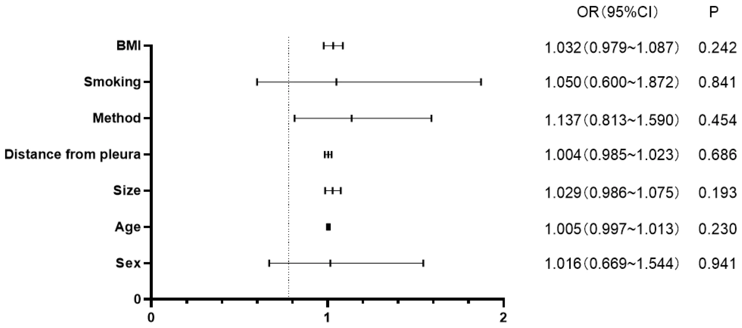 Multivariate logistic regression was used to analyze whether patient age, sex, nodule size, distance of the nodule from the pleura, positioning method, smoking status, BMI, and location of the pulmonary nodule were independent risk factors for complications. The results of the analysis are shown in Table 5. None of the above-mentioned patient characteristics were independent risk factors influencing the occurrence of preoperative positioning complications (p > 0.05).