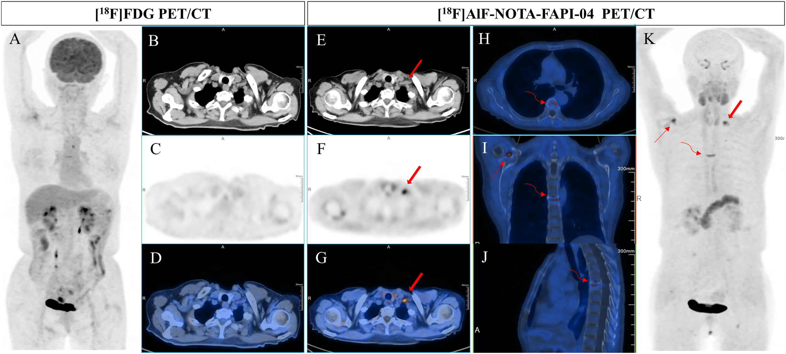 A 61-year-old woman underwent gastric radical resection for a cancer of nine months old and received 6 cycles of SOX therapy. Elevated levels of CEA, CA199, and CA50 (9.5 ng/mL, 98.35 U/mL, and 48.4 IU/mL, respectively) were detected during routine follow-up. To detect potential metastases, she underwent [18F]FDG PET/CT (A-D) examination, which revealed no abnormal uptake in the entire body. However, [18F]AlF-NOTA-FAPI-04 PET/CT (E-H) showed increased tracer uptake in the left supraclavicular lymph node (bold arrow, the SUVmax of 7.9). Additionally, subsequent contrast-enhanced CT demonstrated significant enlargement of the lesion. In addition, [18F]AlF-NOTA-FAPI-04 imaging revealed abnormal uptake in the degenerative bone disease of the sixth thoracic vertebra (H-K, curved arrow) and in the right shoulder joint due to arthritis (I, K, thin arrow), with SUVmax of 6.5 and 7.2, respectively.