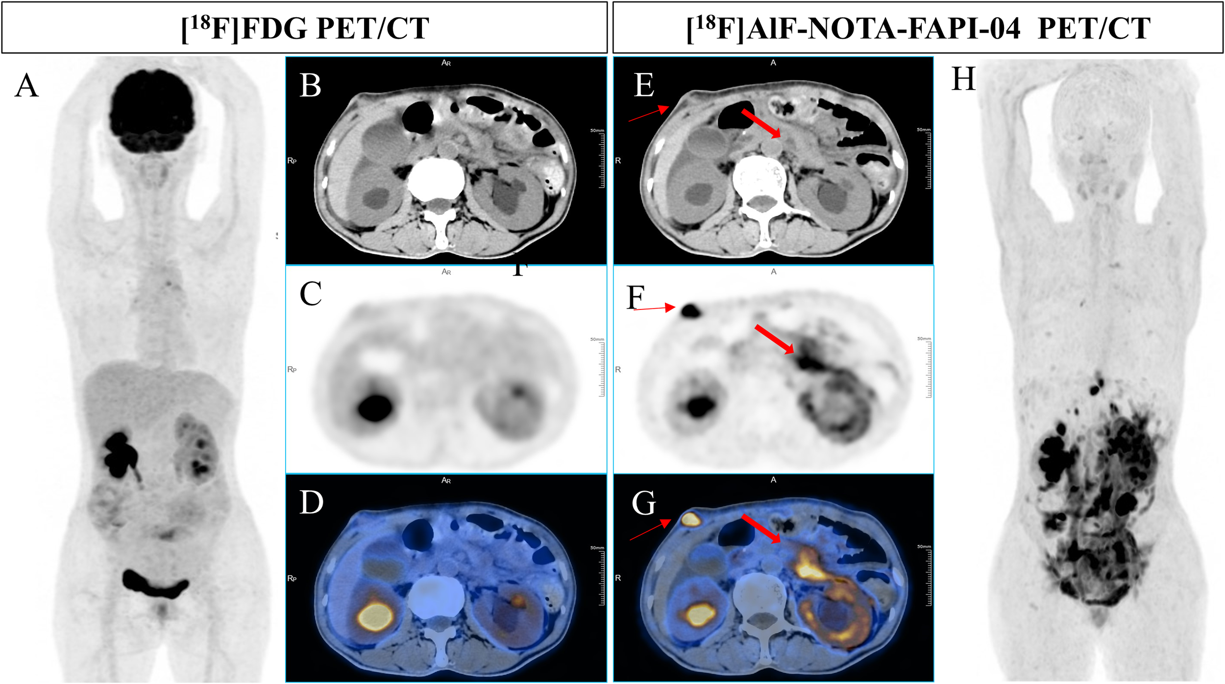 A 49-year-old man underwent radical resection for poorly differentiated adenocarcinoma of the stomach twelve months prior. Subsequent routine CT scans revealed suspected peritoneal carcinomatosis. [18F]FDG PET/CT imaging (A-D) demonstrated no abnormal uptake throughout the whole body. However, [18F]AlF-NOTA-FAPI-04 PET/CT (E-H) revealed increased tracer uptake in the thickened retroperitoneal soft tissue and a mass in the right abdominal wall (bold arrow, SUVmax of 14.5; thin arrow, SUVmax of 21.9). Pathological examination of the biopsy sample from the mass in the right abdominal wall indicated a few atypical round cells, suggesting malignancy.