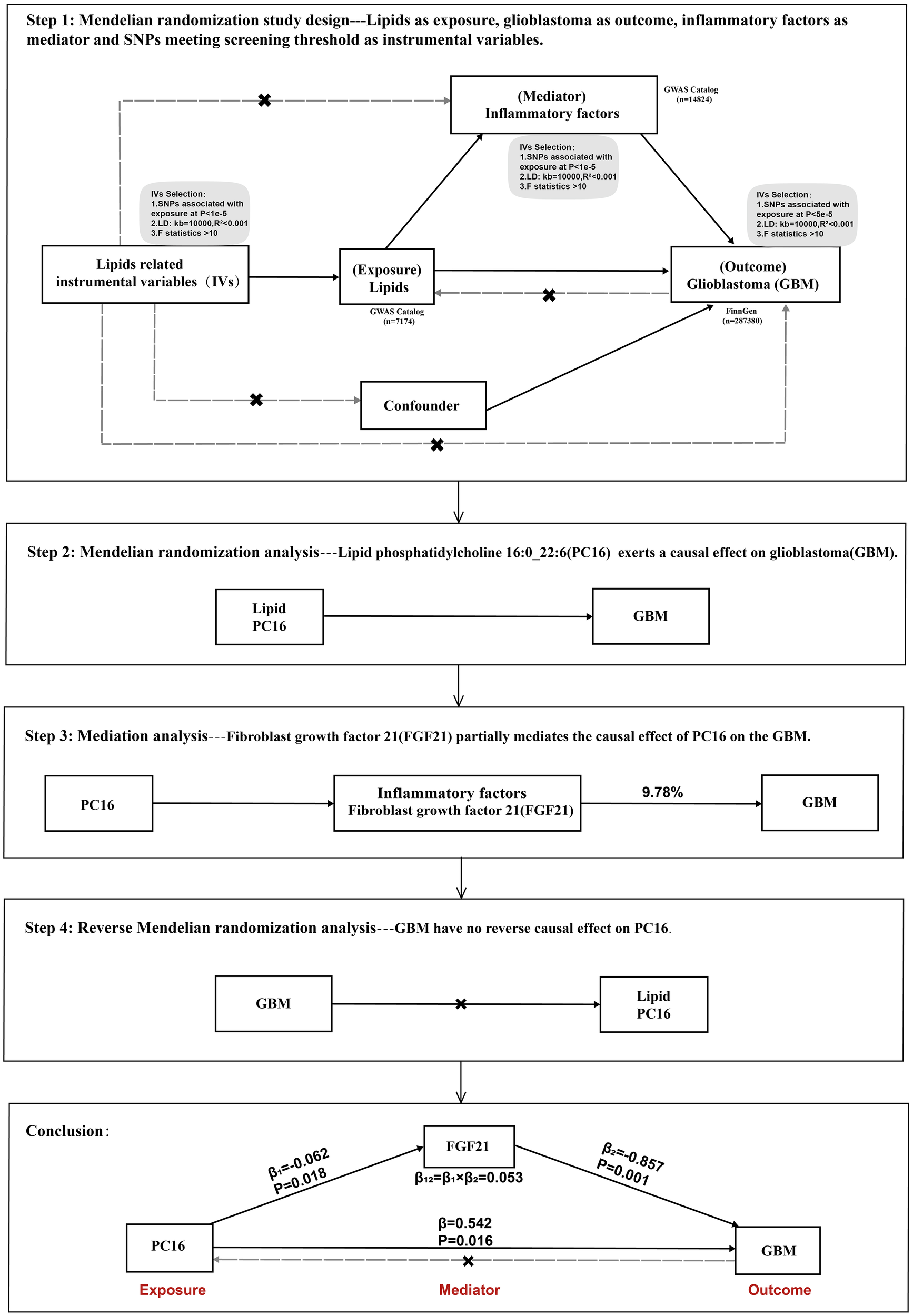 In conclusion, this study confirmed the causal relationship between PC16 and GBM through MR analysis and identified that FGF21 plays a vital mediating role in this causal relationship.