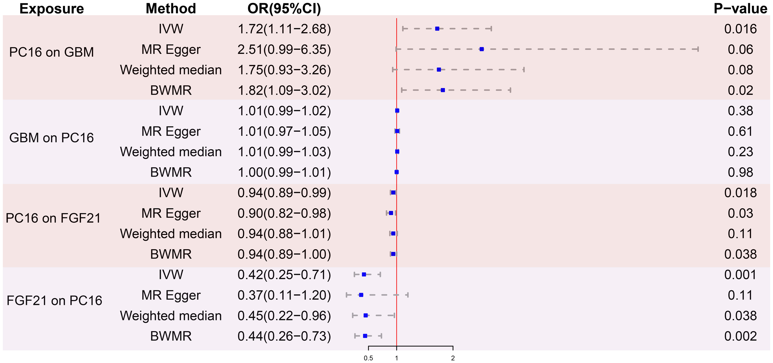 MR analyses revealed a strong causal relationship between PC16 and GBM (OR=1.72, 95% CI: 1.11-2.68, P=0.016), but no reverse causality was observed from GBM to PC16 (OR=1.01, 95% CI: 0.99-1.02, P=0.38). Mediation analysis showed a strong causal relationship between PC16 and the FGF21 (OR = 0.94, 95% CI: 0.89-0.99, P=0.018) as well as between FGF21 and GBM (OR = 0.42, 95% CI: 0.25-0.71, P=0.001), with the mediation effect accounting for 9.78% of the total effect. This suggests that the causal relationship between PC16 and GBM is likely mediated by the intermediary factor FGF21. No evidence of pleiotropy was found in the sensitivity analysis of these positive results.