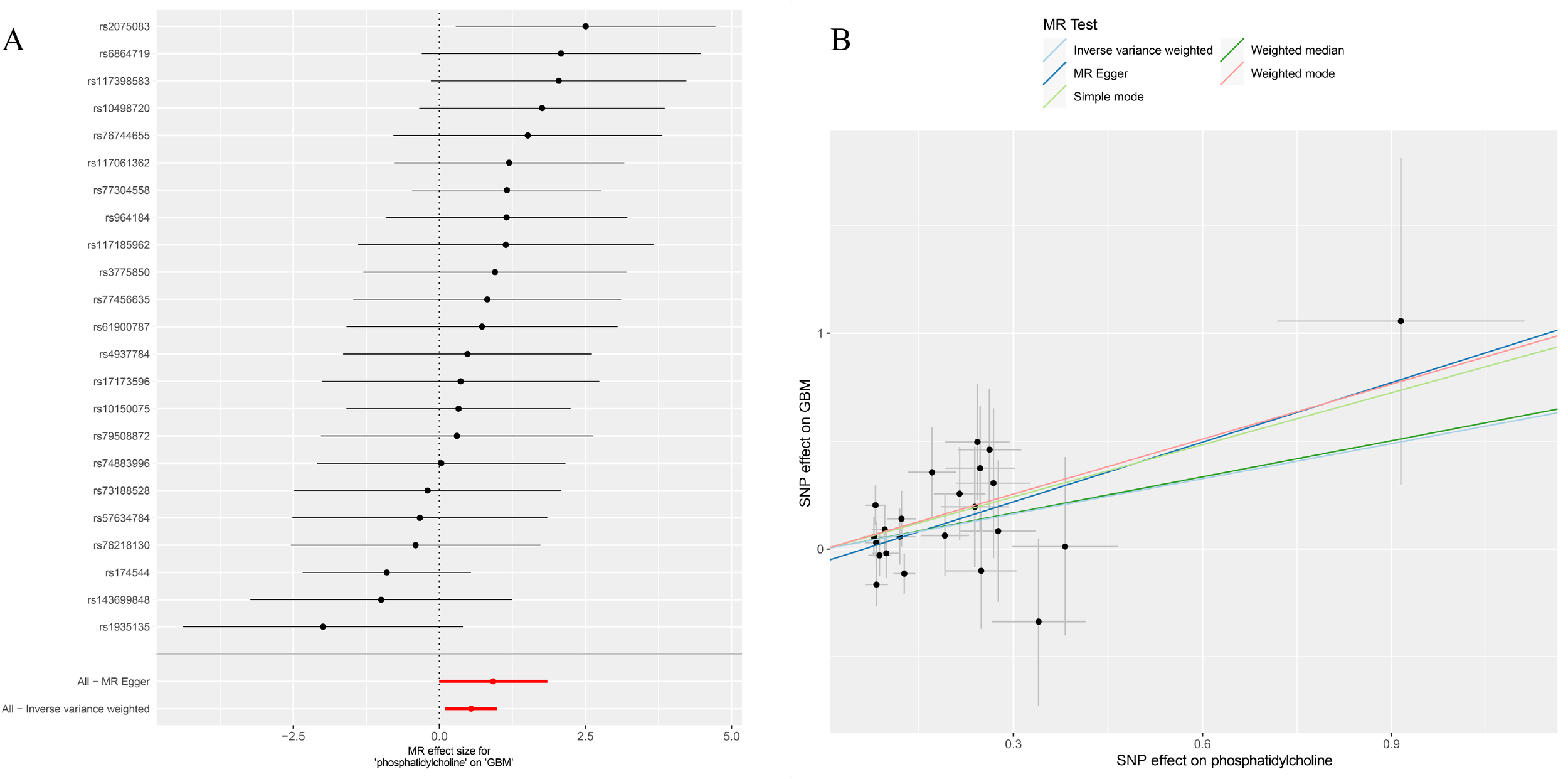 (A) Forest plot to visualize causal effect of each single SNP on total GBM risk; (B) Scatter plots to visualize causal relationship between FGF21 and GBM from different methods. SNP, single nucleotide polymorphism; MR, mendelian randomization; GBM, glioblastoma.