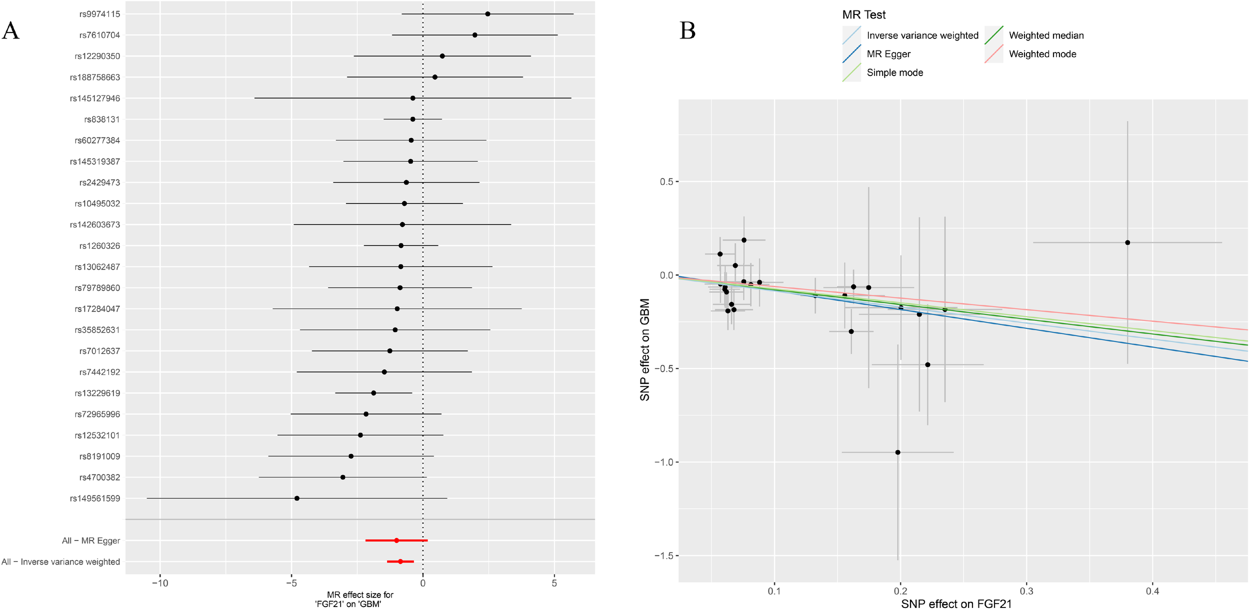 (A) Forest plot to visualize causal effect of each single FGF21 SNP on GBM; (B) the scatter plots to visualize causal relationship between FGF21 and GBM from different methods. SNP, single nucleotide polymorphism; MR, mendelian randomization; GBM, glioblastoma; FGF21, fibroblast growth factor 21.