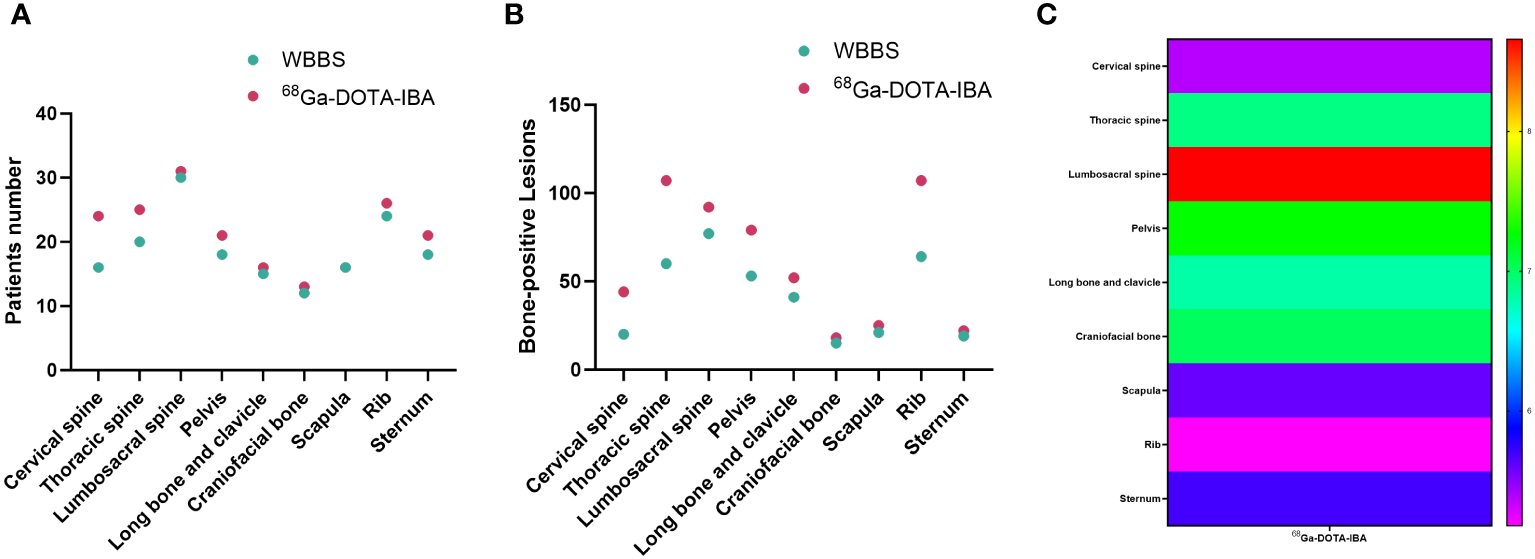 Comparison of 68Ga-DOTA-ibandronate (IBA) PET/CT and 99mTc-MDP bone scan (WBBS) in detecting bone metastases in breast cancer. (A) Number of patients testing positive; (B) Number of positive lesions; (C) Heat maps showing the SUVmax of 68Ga-DOTA-IBA in bone metastases at various anatomical sites.