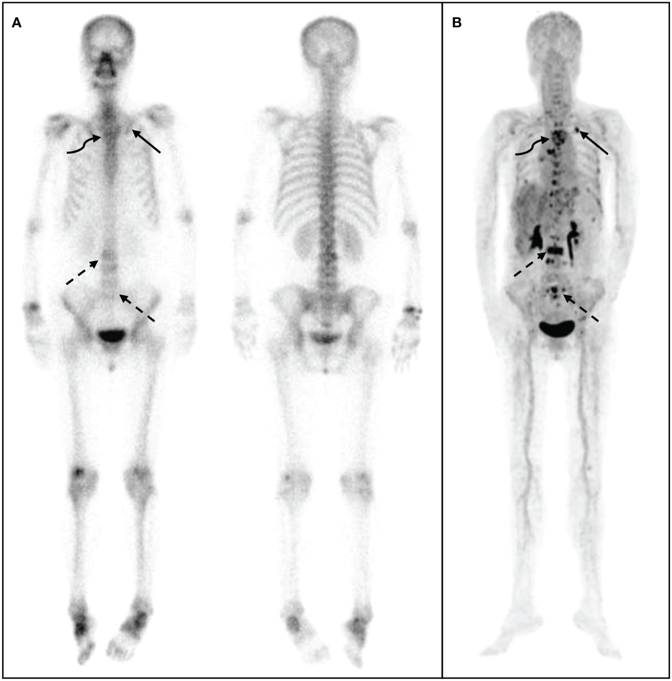 68Ga-DOTA- ibandronate (IBA) PET/CT performed on a 58-year-old woman with breast cancer 10 years following surgical treatment. A 99mTc-MDP bone scan (A) shows no significant increase in bone metabolism, whereas a 68Ga-DOTA-IBA PET/CT shows (B) multiple bone metastases throughout the body and significantly increased bone metabolism in the ribs (straight arrow), spine (dotted arrow), and sternum (curved arrow).