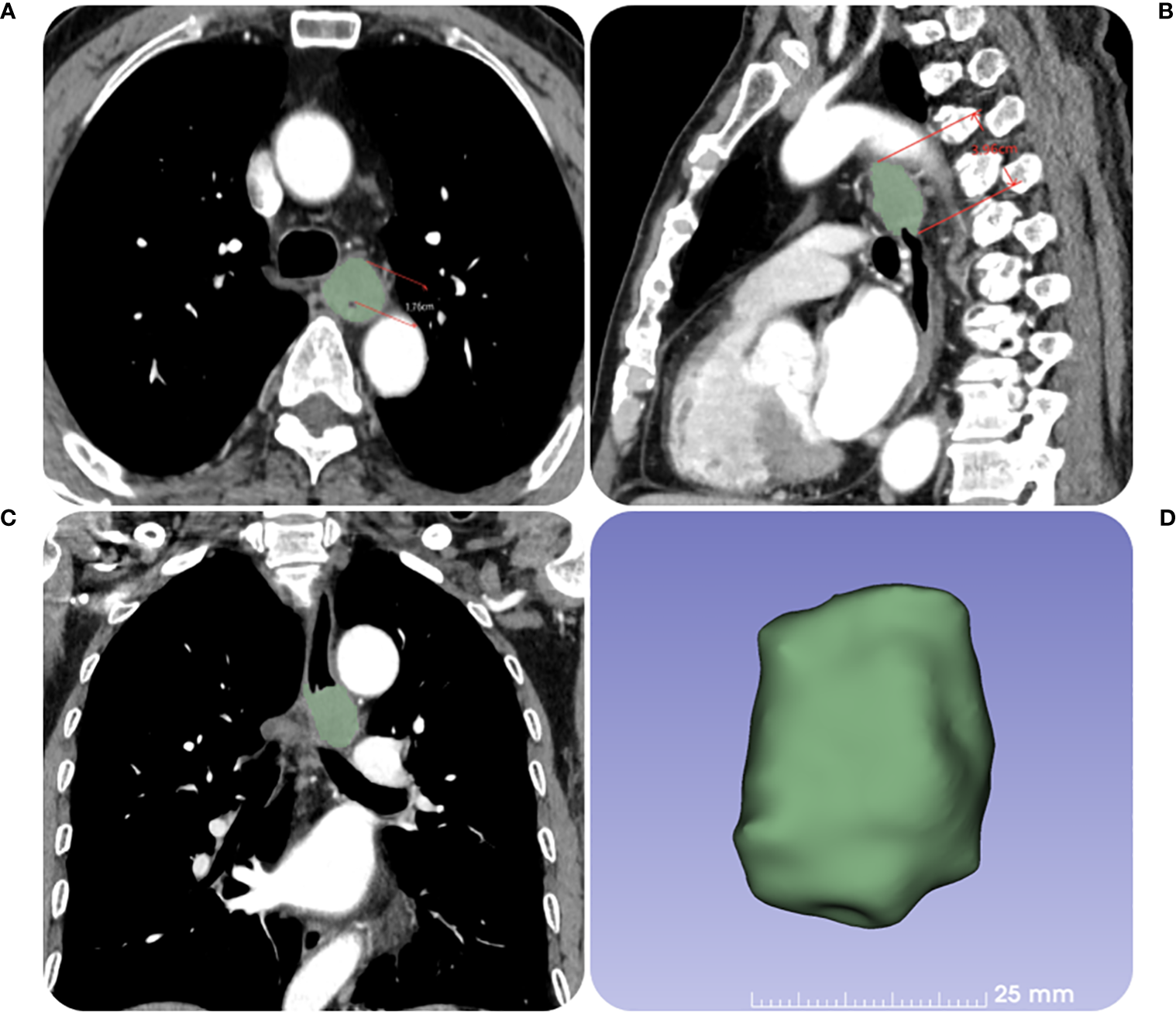 The contrast-enhanced CT images of a 67-year-old female patient with ESCC before RT. (A) The tumor maximal wall thickness is measured in the transverse axial position. (B, C) The tumor length is measured in the sagittal position with reference to the coronal position. (D) The tumor volume is obtained by outlining the tumor layer by layer.