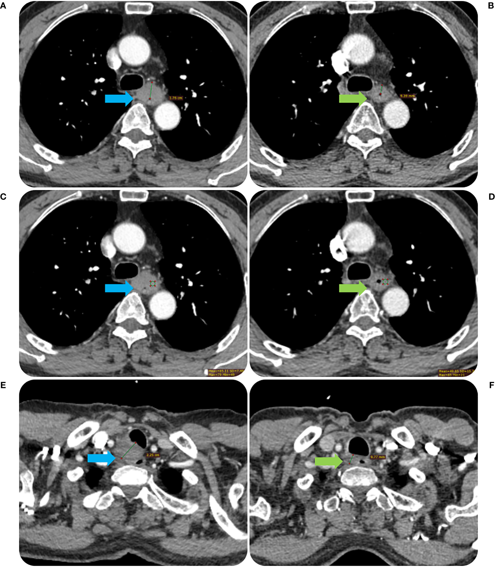 The contrast-enhanced CT images before and after RT of the same patient in Figure 2. The tumor MWT was 1.76 cm before RT treatment (A) and decreased to 0.94 cm after treatment (B). The CT value of the tumor was 65.11 Hu before RT treatment (C) and decreased to 48.85 Hu after treatment (D). The short diameter of the metastatic lymph node in the right proper supra tracheoesophageal sulcus was about 2.25 cm before RT treatment (E), which was reduced to 0.98 cm after treatment (F).