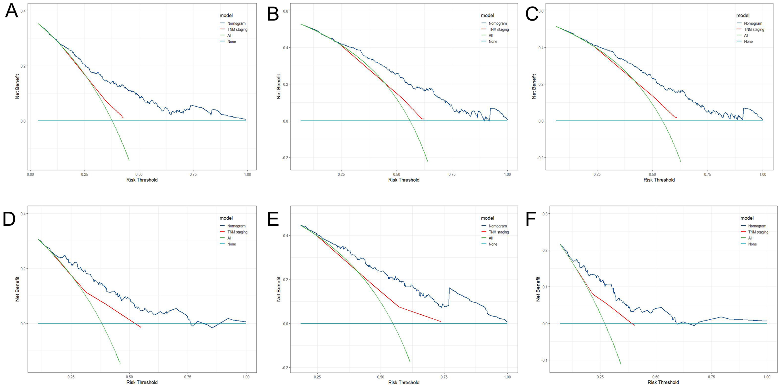 The assessment of the model’s discriminatory ability between the nomogram and conventional TNM staging was done through Harrell’s consistency index (C-index) and the area under the receiver operating characteristic (AUC) curve. Delong test was employed to compare the AUCs between the models. To assess the fit of the model, the Hosmer-Lemeshow goodness-of-fit test was performed. The nomogram’s clinical validity was established using decision curve analysis (DCA), which determined net benefits across various threshold probabilities.
