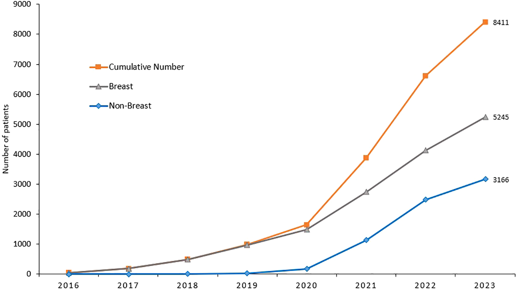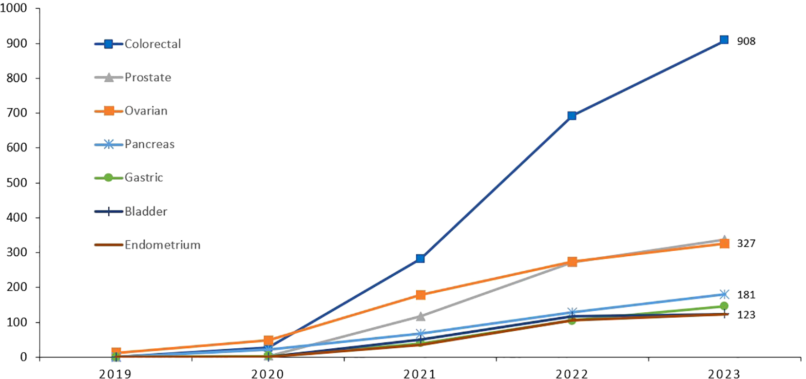 Cumulative number of patients with cancers other than breast, who had germline genetic testing illustrating the significant increase in uptake.