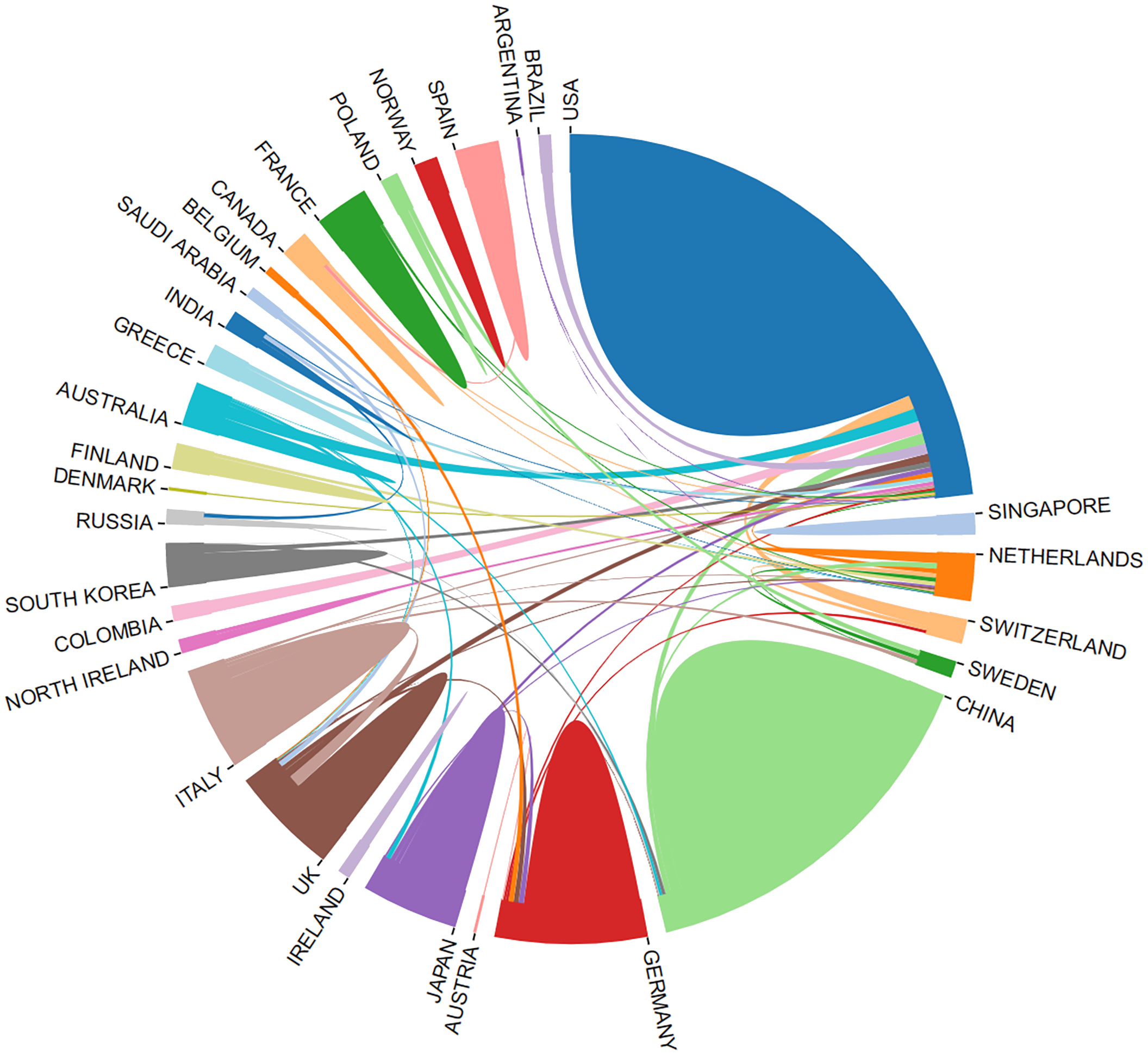 Running the CiteSpace software for country analysis resulted in a knowledge graph with 35 nodes and 80 edges (Figure 2). Each circular node represents a country, with the size indicating the quantity of publications from that country. The connections between nodes represent collaborative relationships between countries, with the thickness of the connections reflecting the degree of collaboration. Different colors of nodes represent different time periods (8), the size of the purple circles reflects the centrality values indicating the influence of each country.