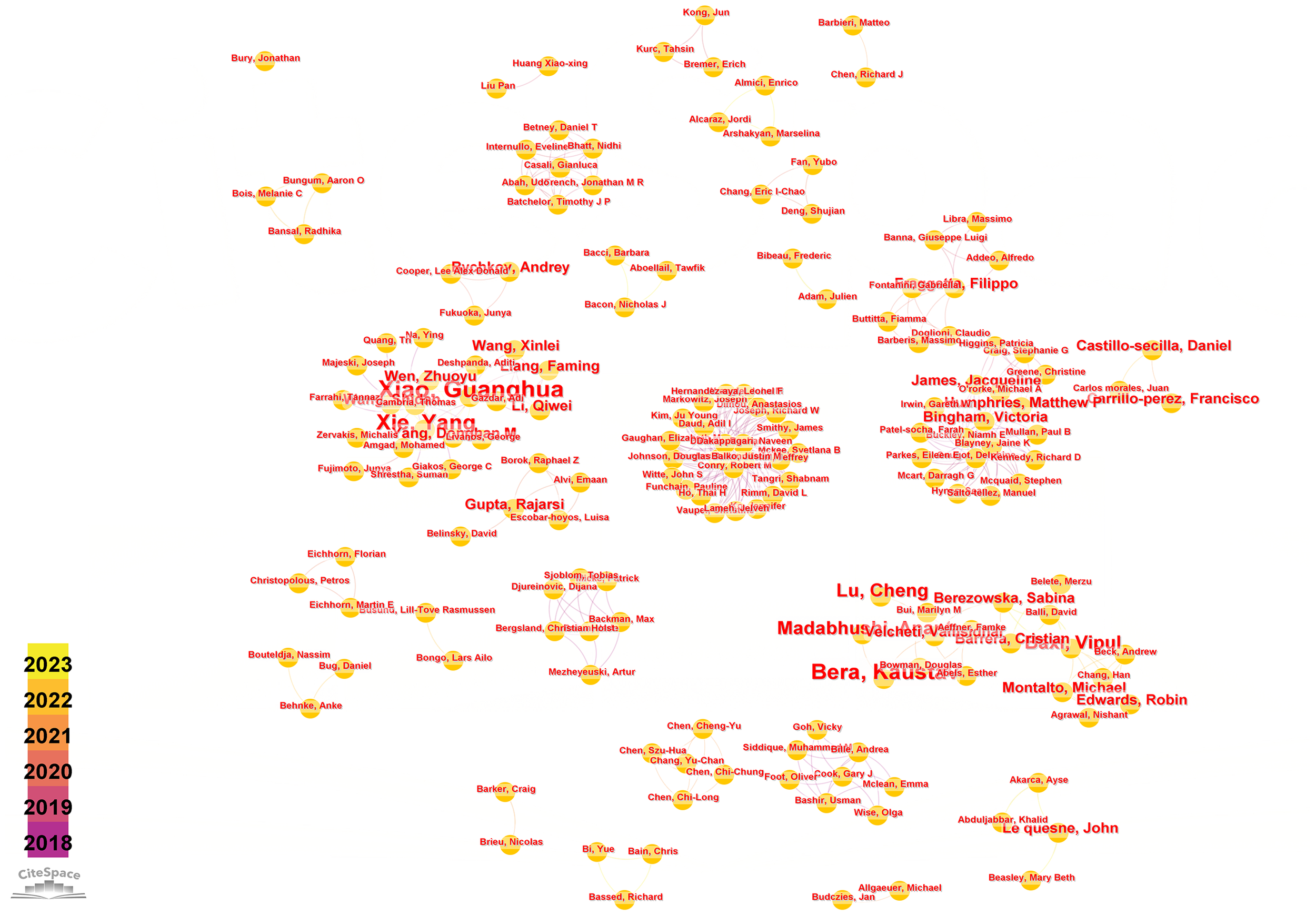 Running the CiteSpace software, author analysis resulted in a knowledge graph with 200 nodes and 383 edges (Figure 4). Each circular node represents an author, and the connections between nodes represent collaborative relationships between authors. The thickness of the connections reflects the degree of collaboration. Different colors of nodes represent different time periods. Conducting a co-occurrence analysis on the author team collaboration network based on the literature retrieved from WoSCC, Table 3 is presented, listing the top 5 authors in terms of publication output along with their affiliated institutions in this research field.