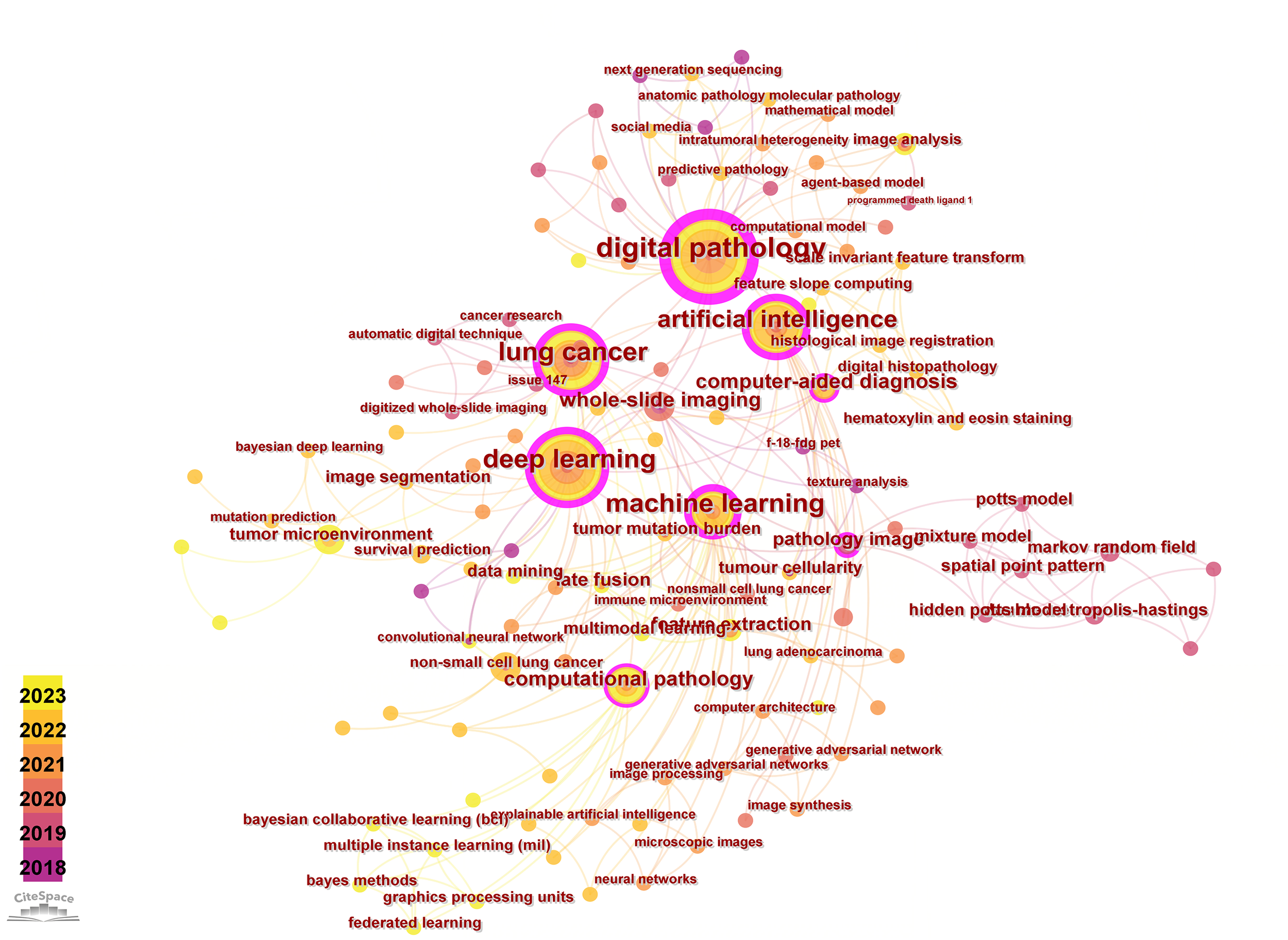 In this study, CiteSpace (7) was utilized for the inaugural analysis of hotspots and trends in the application of pathomics in lung cancer. The objective is to provide valuable insights for scholars involved in research within this domain.
