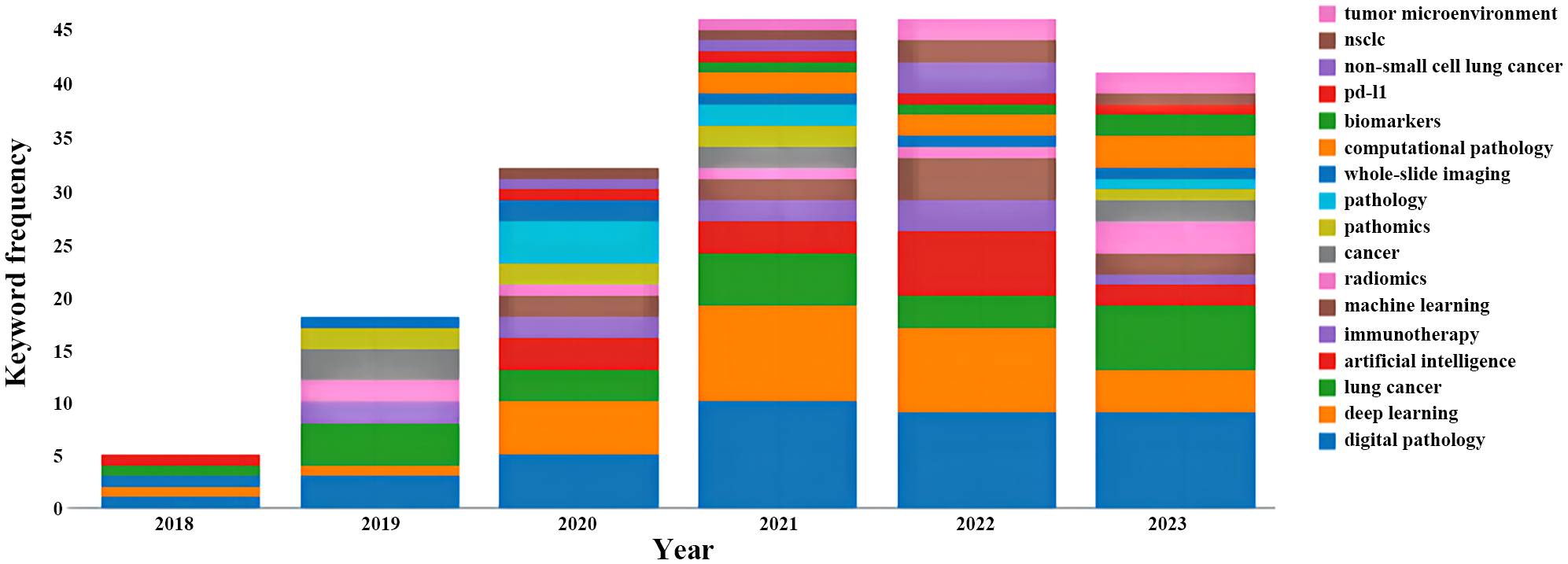 A total of 109 relevant articles or reviews were included, demonstrating an overall upward trend; The terms “deep learning”, “tumor microenvironment”, “biomarkers”, “image analysis”, “immunotherapy”, and “survival prediction”, etc. are hot keywords in this field.