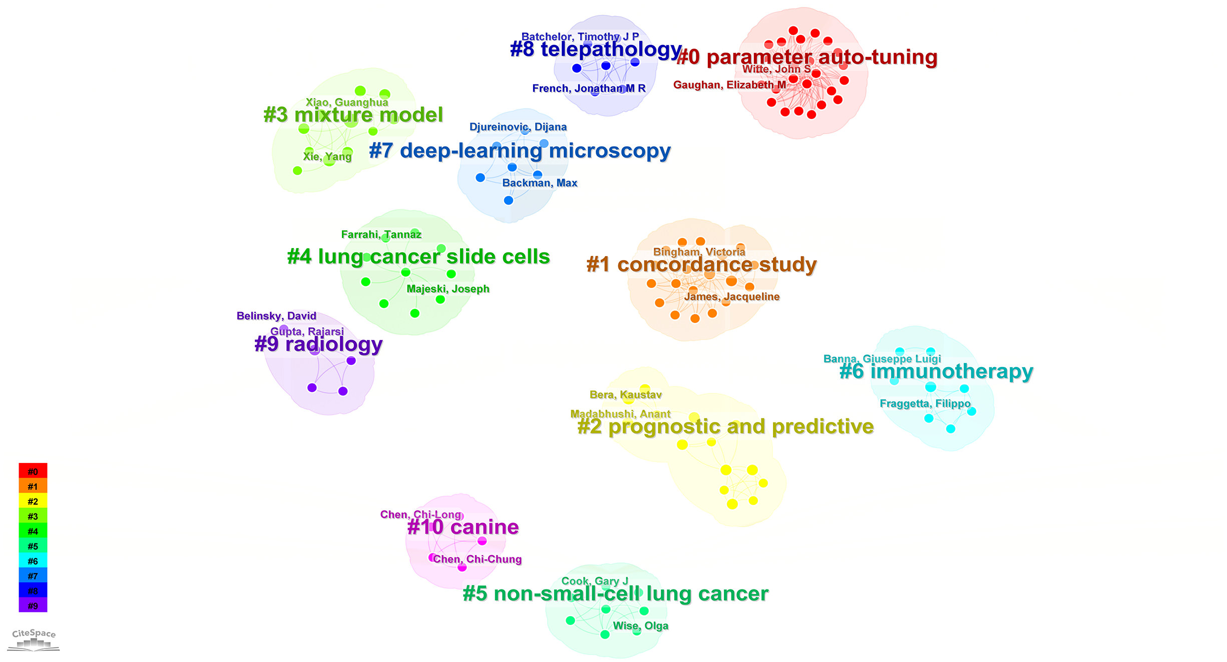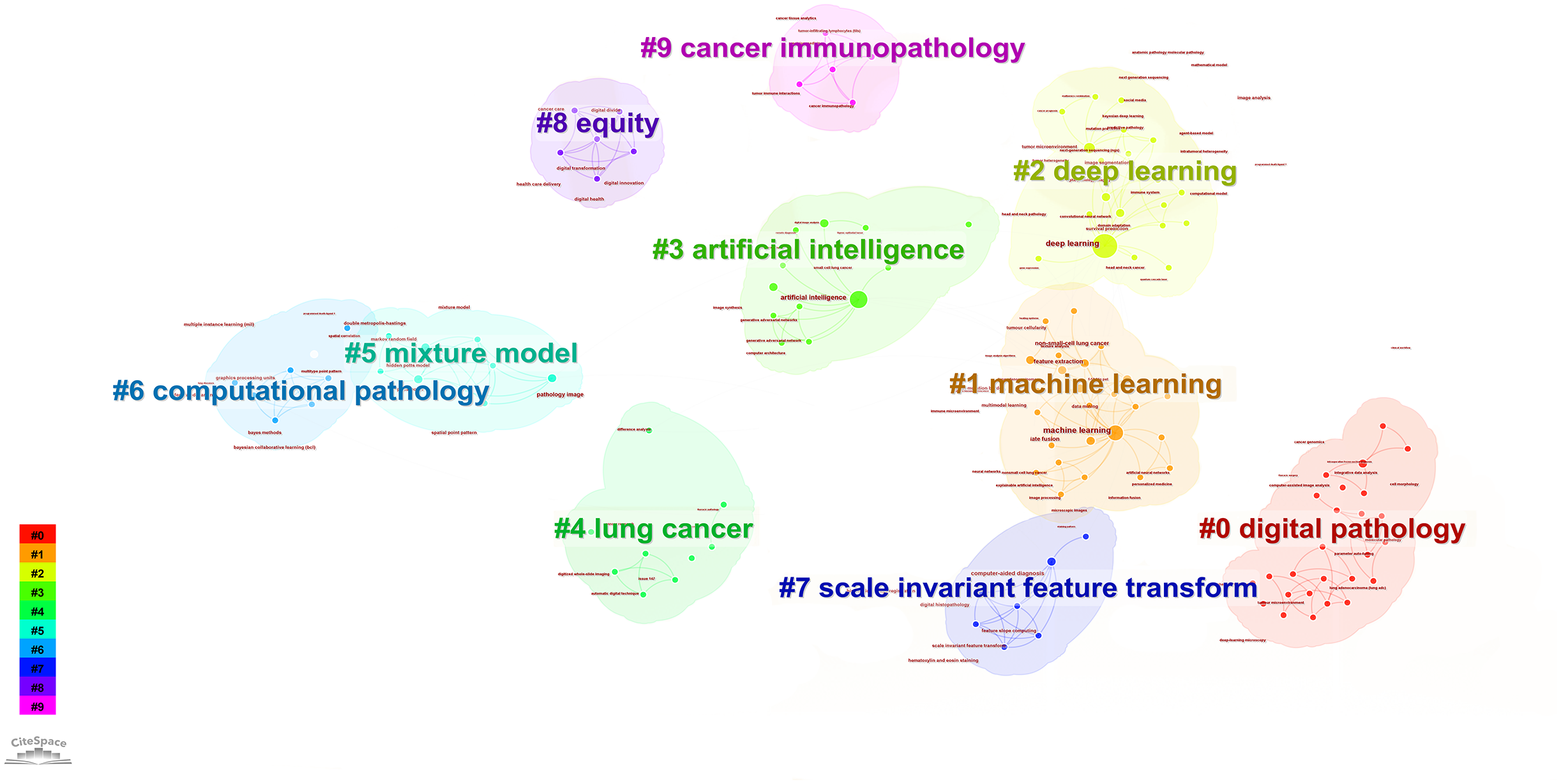 According to the keyword cluster analysis (Figure 7), researchers’ studies are concentrated in the following 10 key areas: #0 parameter auto-tuning; #1 concordance study; #2 prognostic and predictive; #3 mixture model; #4 lung cancer slide cells; #5 non-small-cell lung cancer; #6 immunotherapy; #7 deep-learning microscopy; #8 telepathology; #9 radiology. By employing the clustering algorithm within CiteSpace software to organize title terms and visualize them (Figure 8), a clear sequential pattern emerges, encompassing: #0 spatial quantitative systems pharmacology platform spqsp-io; #1 adaptive radiotherapy; #2 patient survival; #3 pd-11 expression; #4 digital analysis; #5 Bayesian hidden Potts mixture model; #6 bayesian collaborative learning; #7 multi-stained feature matching; #8 oncology; #9 pathomics; Utilizing the clustering algorithm in CiteSpace to group subject categories and create a visual representation (Figure 9), a sequential progression of clusters is discernible, including: #0 Pathology; #1 Mathematics; #2 Medicine, Research & Experimental; #3 Computer Science, Theory & Methods; #4 Engineering, Multidisciplinary; #5 Statistics & Probability; #6 Imaging Science & Photographic Technology; #7 Biology; #8 Health Care Sciences Services; #9 Cell Biology. Employing the clustering algorithm for keywords and generating a graphical display (Figure 10), a sequential evolution of clusters is evident, incorporating: #0 digital pathology; #1 machine learning; #2 deep learning; #3 artificial intelligence; #4 lung cancer; # 5mixture model; #6 computational pathology; #7 scale invariant feature transform; #8 equity; #9 cancer immunopathology.