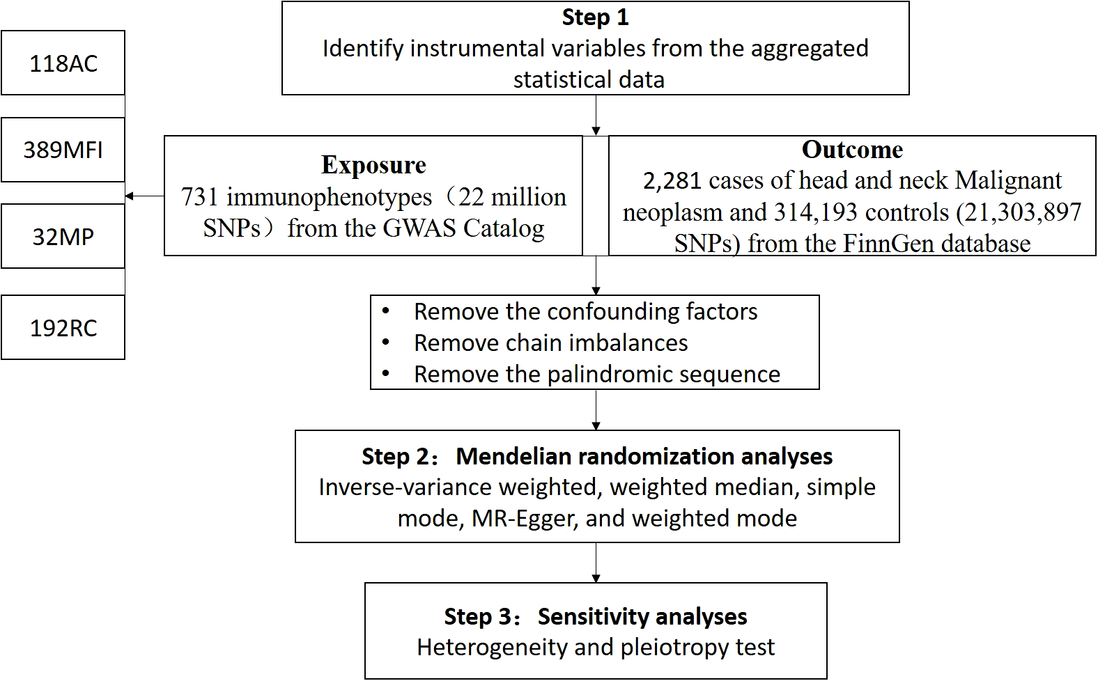 We evaluated the causal relationships between 731 immune cell phenotypes and HNMN using MR analysis. A flowchart of the study is shown in Figure 1. MR uses genetic variation to represent risk factors; therefore, meaningful IVs used in MR must meet three main presuppositions (1): IVs have a strong direct relationship with exposure (2), IVs do not correlate with possible confounders between exposure and outcome, and (3) IVs do not influence the outcome through pathways other than exposure. This study was conducted according to the Strengthening the Reporting of Observational Studies in Epidemiology Using Mendelian Randomization Guidelines (STROBE-MR, S1 Checklist) (15).